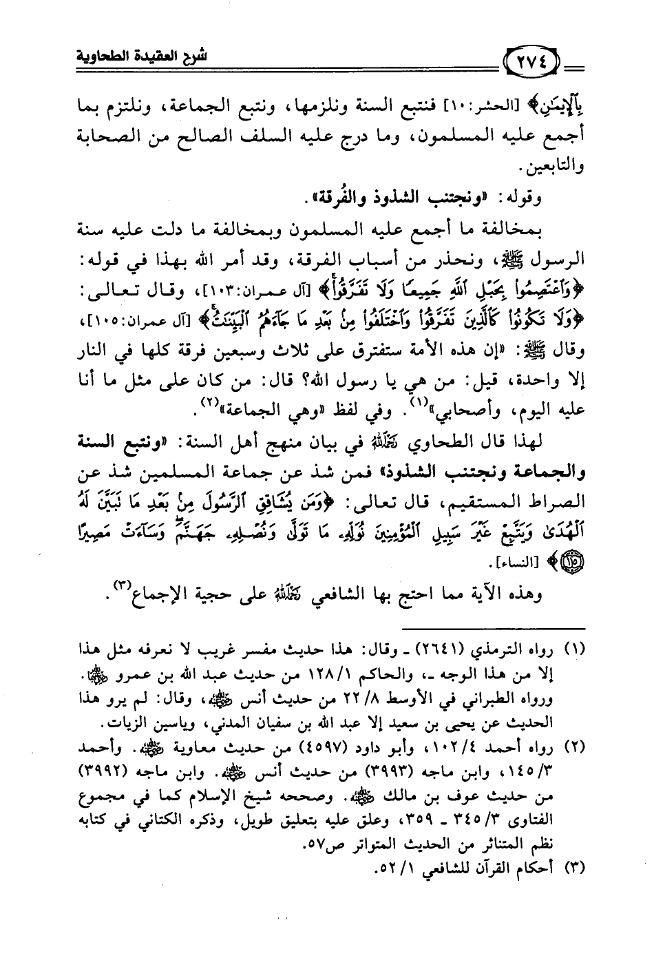 لهذا قال الطحاوي ـ رحمه الله ـ في بيان منهج أهل السنة: (ونتبع السنة والجماعة ونجتنب الشذوذ) فمن شذ عن جماعة المسلمين شذ عن الصراط المستقيم، قال تعالى: ((وَمَنْ يُشَاقِقِ الرَّسُولَ مِنْ بَعْدِ مَا تَبَيَّنَ لَهُ الْهُدَى وَيَتَّبِعْ غَيْرَ سَبِيلِ الْمُؤْمِنِينَ نُوَلِّهِ مَا تَوَلَّى وَنُصْلِهِ جَهَنَّمَ وَسَاءَتْ مَصِيرَاً)) [النساء: 115].