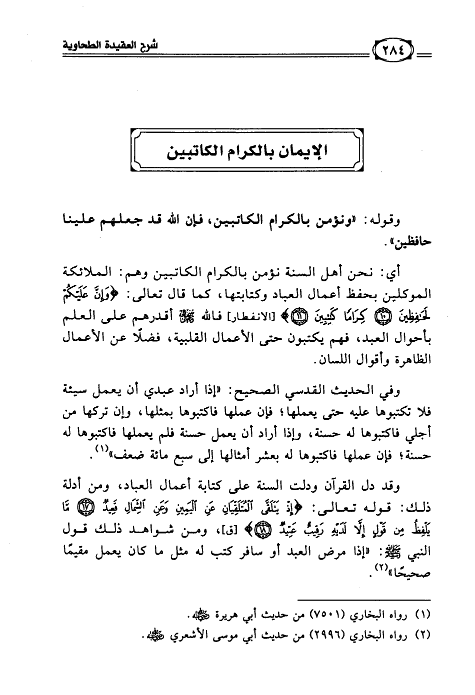 أي: نحن أهل السنة نؤمن بالكرام الكاتبين وهم: الملائكة الموكلين بحفظ أعمال العباد وكتابتها، كما قال تعالى: {وَإِنَّ عَلَيْكُمْ لَحَافِظِينَ * كِرَامًا كَاتِبِينَ} [الانفطار: 10 - 11] فالله سبحانه وتعالى أقدرهم على العلم بأحوال العبد، فهم يكتبون حتى الأعمال القلبية، فضلا عن الأعمال الظاهرة وأقوال اللسان.