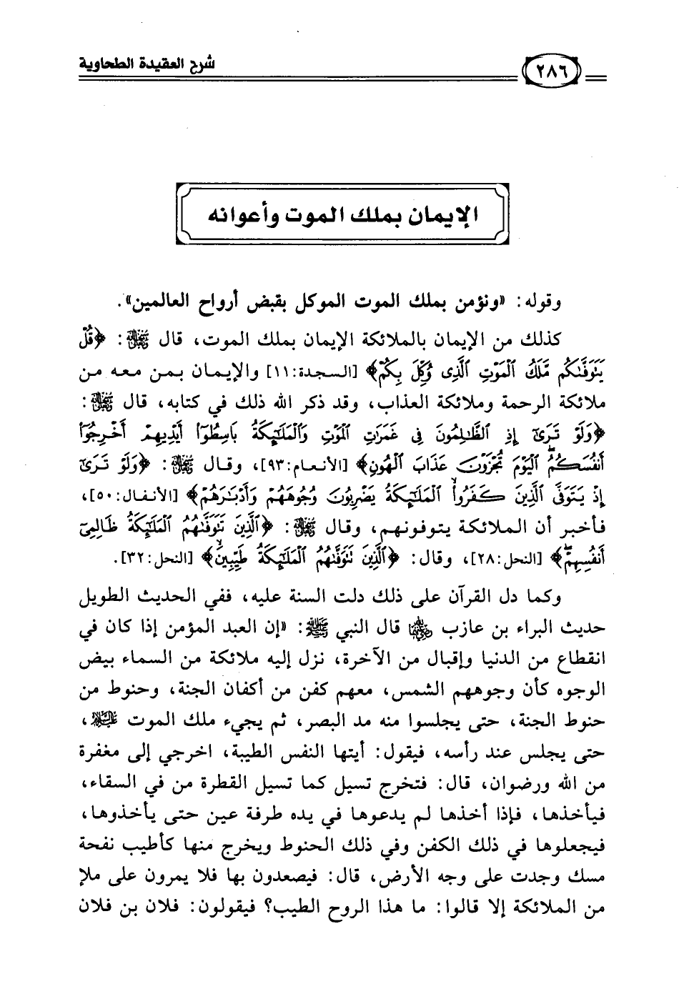 وكما دل القرآن على ذلك دلت السنة عليه، ففي الحديث الطويل حديث البراء بن عازب ـ رضي الله عنهما ـ قال النبي - صلى الله عليه وسلم - (إن العبد المؤمن إذا كان في انقطاع من الدنيا وإقبال من الآخرة نزل إليه ملائكة من السماء بيض الوجوه كأن وجوههم الشمس، معهم كفن من أكفان الجنة، وحنوط من حنوط الجنة، حتى يجلسوا منه مد البصر، ثم يجيء ملك الموت عليه السلام، حتى يجلس عند رأسه، فيقول: أيتها النفس الطيبة اخرجي إلى مغفرة من الله ورضوان قال فتخرج تسيل كما تسيل القطرة من في السقاء، فيأخذها، فإذا أخذها لم يدعوها في يده طرفة عين حتى يأخذوها، فيجعلوها في ذلك الكفن وفي ذلك الحنوط ويخرج منها كأطيب نفحة مسك وجدت على وجه الأرض، قال: فيصعدون بها فلا يمرون يعني بها على ملإ من الملائكة إلا قالوا: ما هذا الروح الطيب؟ فيقولون: فلان بن فلان