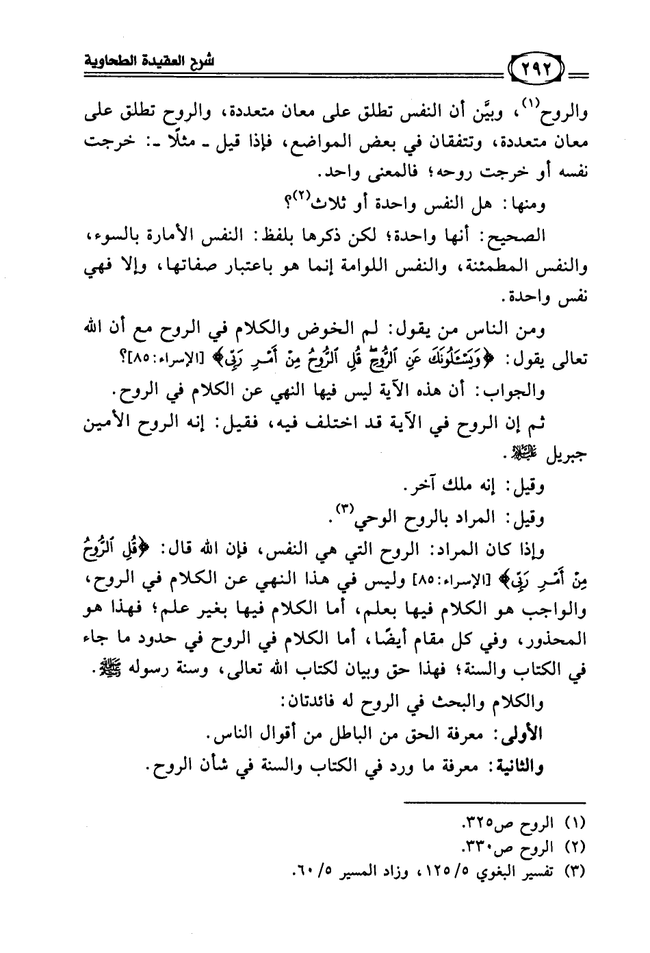 والروح (¬1)، وبيَّن أن النفس تطلق على معان متعددة، والروح تطلق على معان متعددة، وتتفقان في بعض المواضع، فإذا قيل ـ مثلاـ: خرجت نفسه أو خرجت روحه؛ فالمعنى واحد.