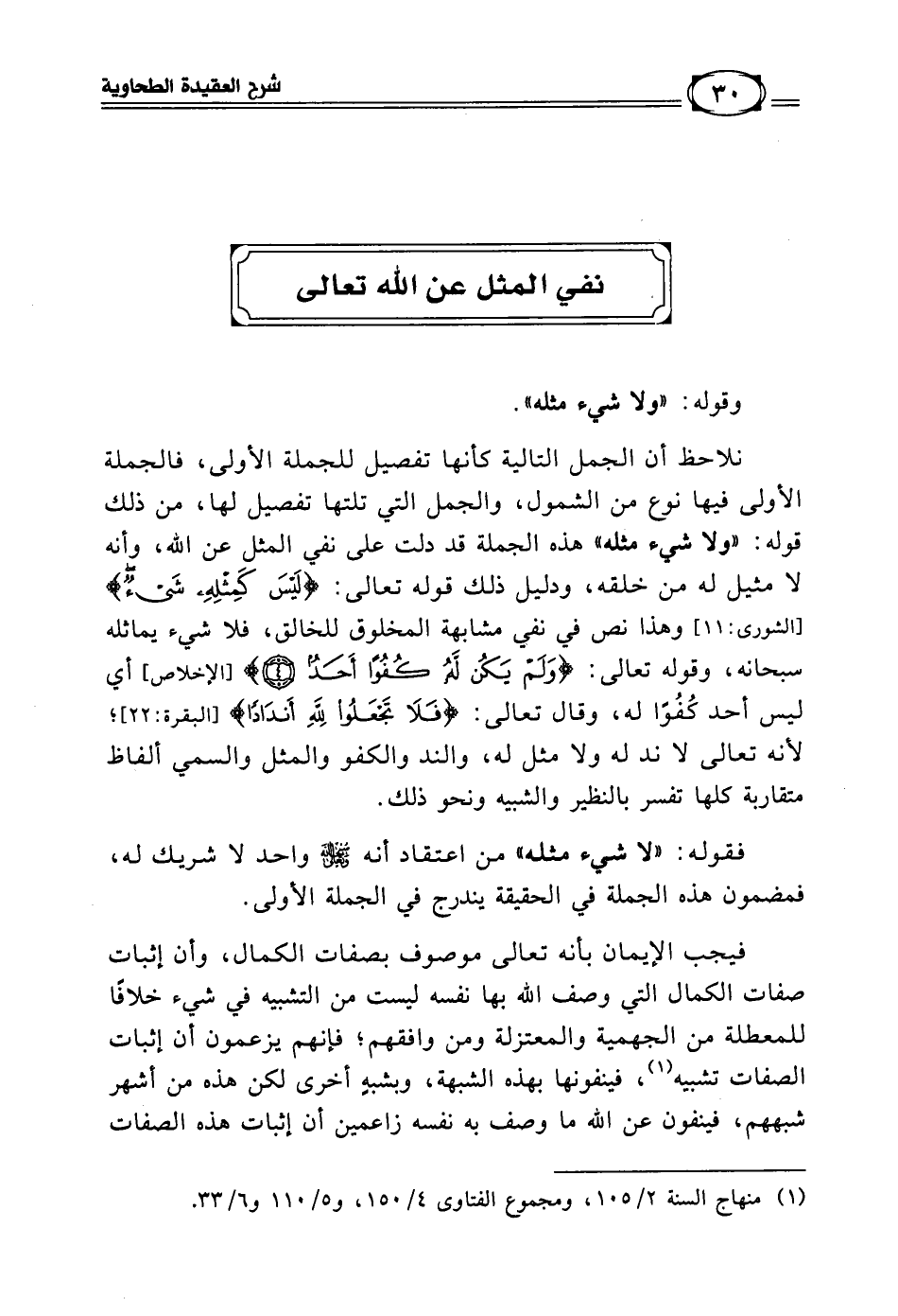 يجب الإيمان بأنه تعالى موصوف بصفات الكمال، وأن إثبات صفات الكمال التي وصف الله بها نفسه ليست من التشبيه في شيء خلافا للمعطلة من الجهمية والمعتزلة ومن وافقهم؛ فإنهم يزعمون أن إثبات الصفات (¬1)، فينفونها بهذه الشبهة، وبشبهٍ أخرى لكن هذه من أشهر شبههم، فينفون عن الله ما وصف به نفسه زاعمين أن إثبات هذه الصفات