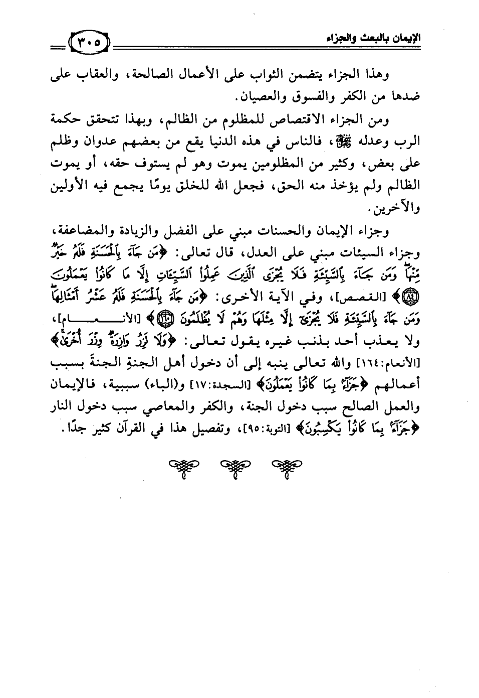 وجزاء الإيمان والحسنات مبني على الفضل والزيادة والمضاعفة، وجزاء السيئات مبني على العدل، قال تعالى: ((مَن جَاء بِالْحَسَنَةِ فَلَهُ خَيْرٌ مِّنْهَا وَمَن جَاء بِالسَّيِّئَةِ فَلَا يُجْزَى الَّذِينَ عَمِلُوا السَّيِّئَاتِ إِلَّا مَا كَانُوا يَعْمَلُونَ)) [القصص: 84]، وفي الآية الأخرى: ((مَنْ جَاءَ بِالْحَسَنَةِ فَلَهُ عَشْرُ أَمْثَالِهَا وَمَنْ جَاءَ بِالسَّيِّئَةِ فَلا يُجْزَى إِلَّا مِثْلَهَا وَهُمْ لا يُظْلَمُونَ)) [الأنعام: 160]، ولا يعذب أحد بذنب غيره يقول تعالى: ((وَلا تَزِرُ وَازِرَةٌ وِزْرَ أُخْرَى)) [الأنعام: 164] والله تعالى ينبه إلى أن دخول أهل الجنةِ الجنةَ بسبب أعمالهم ((جَزَاءً بِمَا كَانُوا يَعْمَلُونَ)) [السجدة: 17] و (الباء) سببية، فالإيمان والعمل الصالح سبب دخول الجنة، والكفر والمعاصي سبب دخول النار ((جَزَاءً بِمَا كَانُوا يَكْسِبُونَ)) [التوبة: 95]، وتفصيل هذا في القرآن كثير جدا.