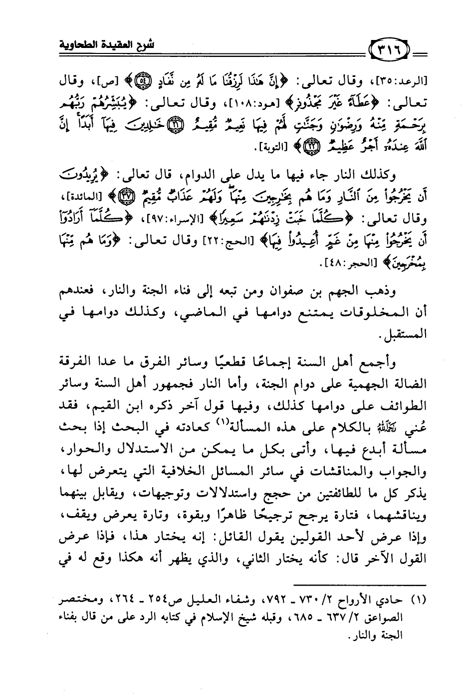 (¬1) «حادي الأرواح» 2/ 730 - 792، و «شفاء العليل» ص 254 - 264، و «مختصر الصواعق» 2/ 637 - 685، وقبله شيخ الإسلام في كتابه «الرد على من قال بفناء الجنة والنار».