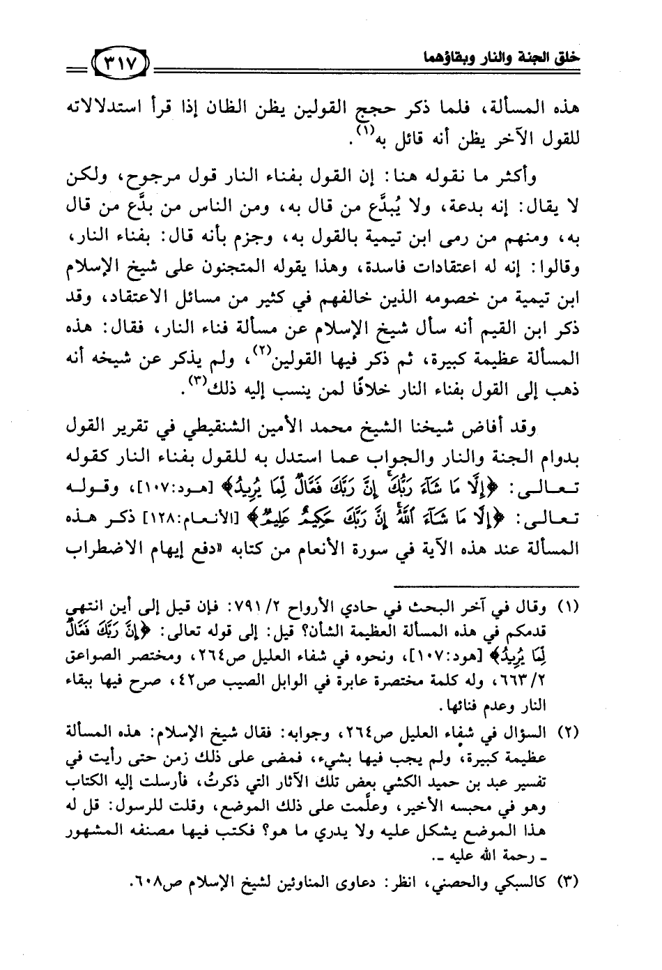 وقال أفاض شيخنا الشيخ محمد الأمين الشنقيطي في تقرير القول بدوام الجنة والنار والجواب عما استدل به للقول بفناء النار كقوله تعالى: ((إِلَّا مَا شَاءَ رَبُّكَ إِنَّ رَبَّكَ فَعَّالٌ لِمَا يُرِيدُ)) [هود: 107]، وقوله تعالى: ((إِلَّا مَا شَاءَ اللَّهُ إِنَّ رَبَّكَ حَكِيمٌ عَلِيمٌ)) [الأنعام: 128] ذكر هذه المسألة عند هذه الآية في سورة الأنعام من كتابه «دفع إيهام الاضطراب