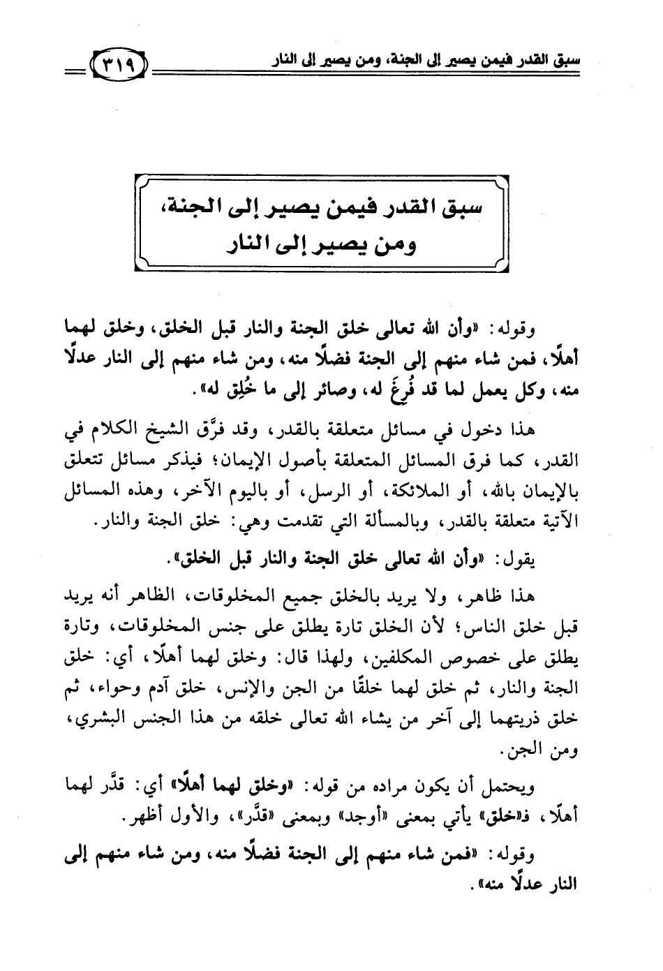 وقوله: (وأن الله تعالى خلق الجنة والنار قبل الخلق، وخلق لهما أهلا، فمن شاء منهم إلى الجنة فضلا منه، ومن شاء منهم إلى النار عدلا منه، وكل يعمل لما قد فُرِغَ له وصائر إلى ما خُلِق له)
