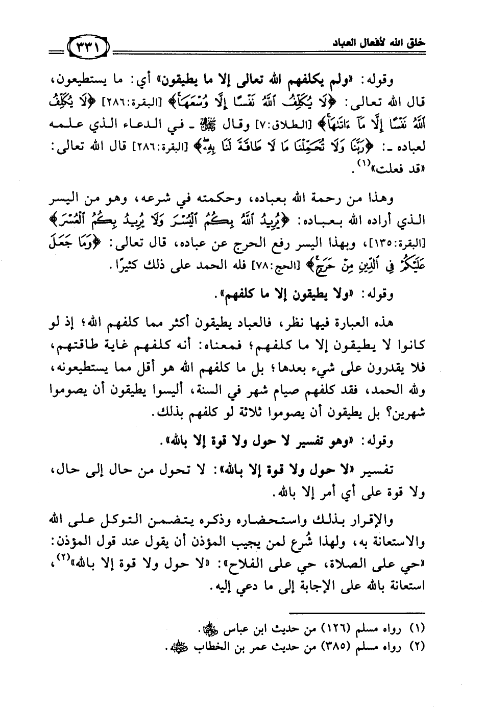 وقوله: (ولم يكلفهم الله تعالى إلا ما يطيقون) أي: ما يستطيعون، قال الله تعالى: {لاَ يُكَلِّفُ اللهُ نَفْسًا إِلاَّ وُسْعَهَا} [البقرة: 286] {لَا يُكَلِّفُ اللَّهُ نَفْسًا إِلَّا مَا آتَاهَا} [الطلاق: 7] وقال سبحانه وتعالى ـ في الدعاء الذي علمه لعباده ـ: {رَبَّنَا وَلاَ تُحَمِّلْنَا مَا لاَ طَاقَةَ لَنَا بِهِ} [البقرة: 286] قال الله تعالى: «قد فعلت» (¬1).