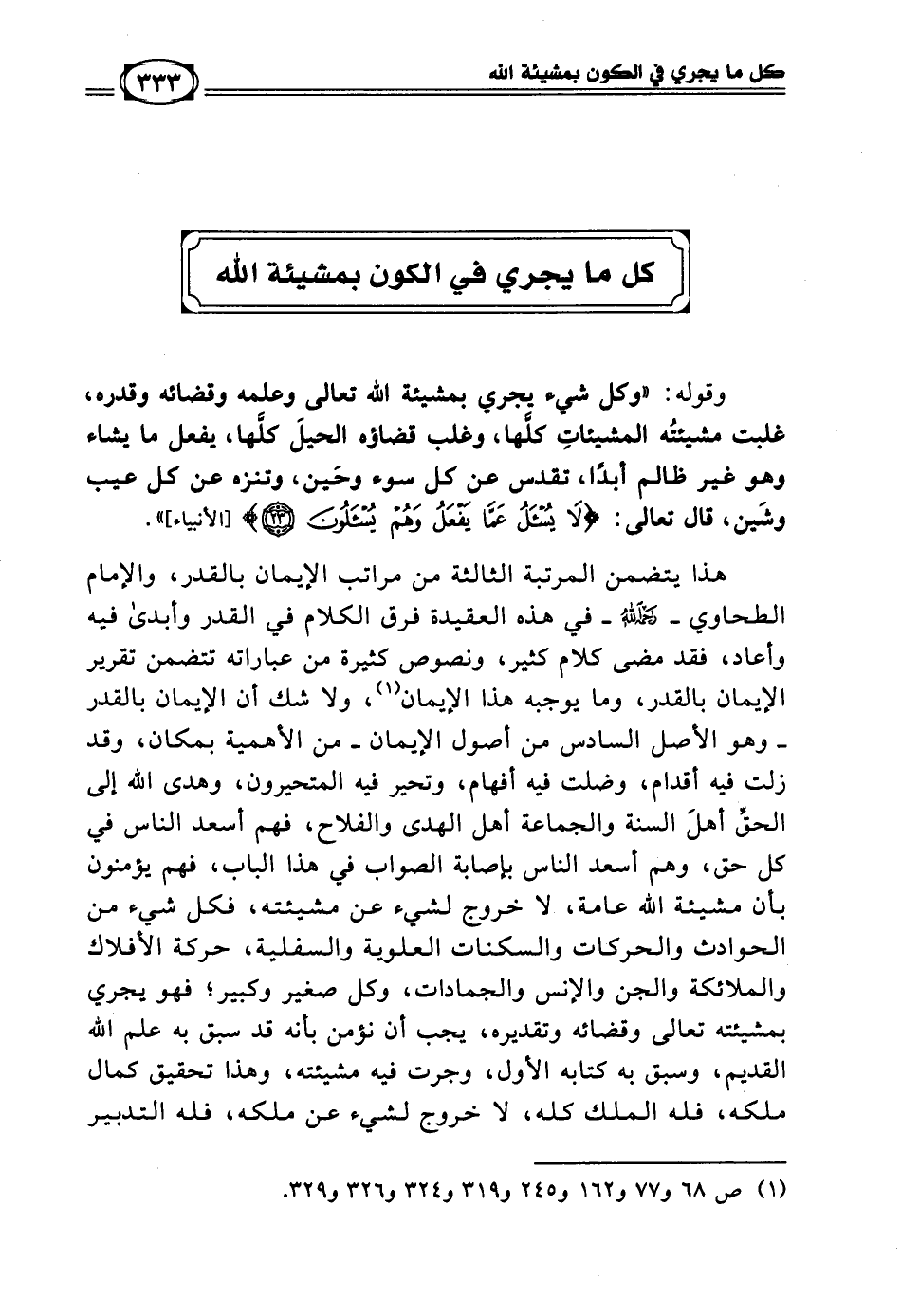 وقوله: (وكل شيء يجري بمشيئة الله تعالى وعلمه وقضائه وقدره، غلبت مشيئتُه المشيئاتِ كلَها، وغلب قضاؤه الحيلَ كلَها، يفعل ما يشاء وهو غير ظالم أبدا، تقدس عن كل سوء وحَين، وتنزه عن كل عيب وشَين، قال تعالى: ((لا يُسْأَلُ عَمَّا يَفْعَلُ وَهُمْ يُسْأَلُونَ)) [الأنبياء: 23]).