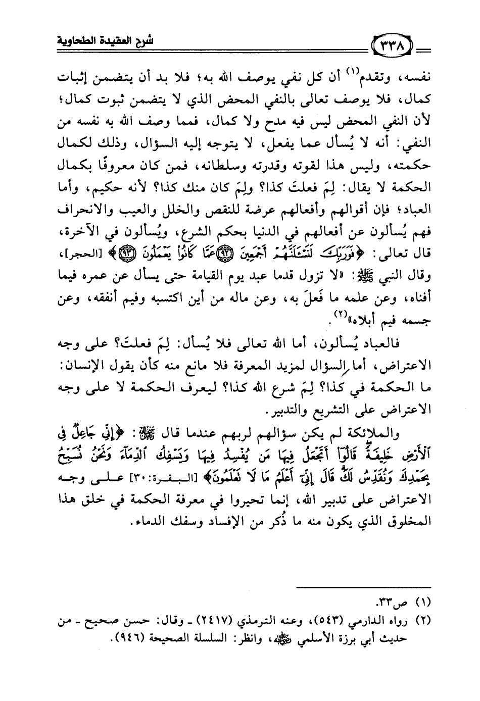 نفسه، وتقدم (¬1) أن كل نفي يوصف الله به؛ فلا بد أن يتضمن إثبات كمال، فلا يوصف تعالى بالنفي المحض الذي لا يتضمن ثبوت كمال؛ لأن النفي المحض ليس فيه مدح ولا كمال، فمما وصف الله به نفسه من النفي: أنه لا يُسأل عما يفعل، لا يتوجه إليه السؤال، وذلك لكمال حكمته، وليس هذا لقوته وقدرته وسلطانه، فمن كان معروفا بكمال الحكمة لا يقال: لِمَ فعلتَ كذا؟ ولِمَ كان منك كذا؟ لأنه حكيم، وأما العباد فإن أقوالهم وأفعالهم عرضة للنقص والخلل والعيب والانحراف فهم يُسألون عن أفعالهم في الدنيا بحكم الشرع، ويُسألون في الآخرة، قال تعالى: ((فَوَرَبِّكَ لَنَسْأَلَنَّهُمْ أَجْمَعِينَ * عَمَّا كَانُوا يَعْمَلُونَ)) [الحجر: 92 - 93]، وقال النبي - صلى الله عليه وسلم -: (لا تزول قدما عبد يوم القيامة حتى يسأل عن عمره فيما أفناه، وعن علمه ما فَعلَ به، وعن ماله من أين اكتسبه وفيم أنفقه، وعن جسمه فيم أبلاه) (¬2).