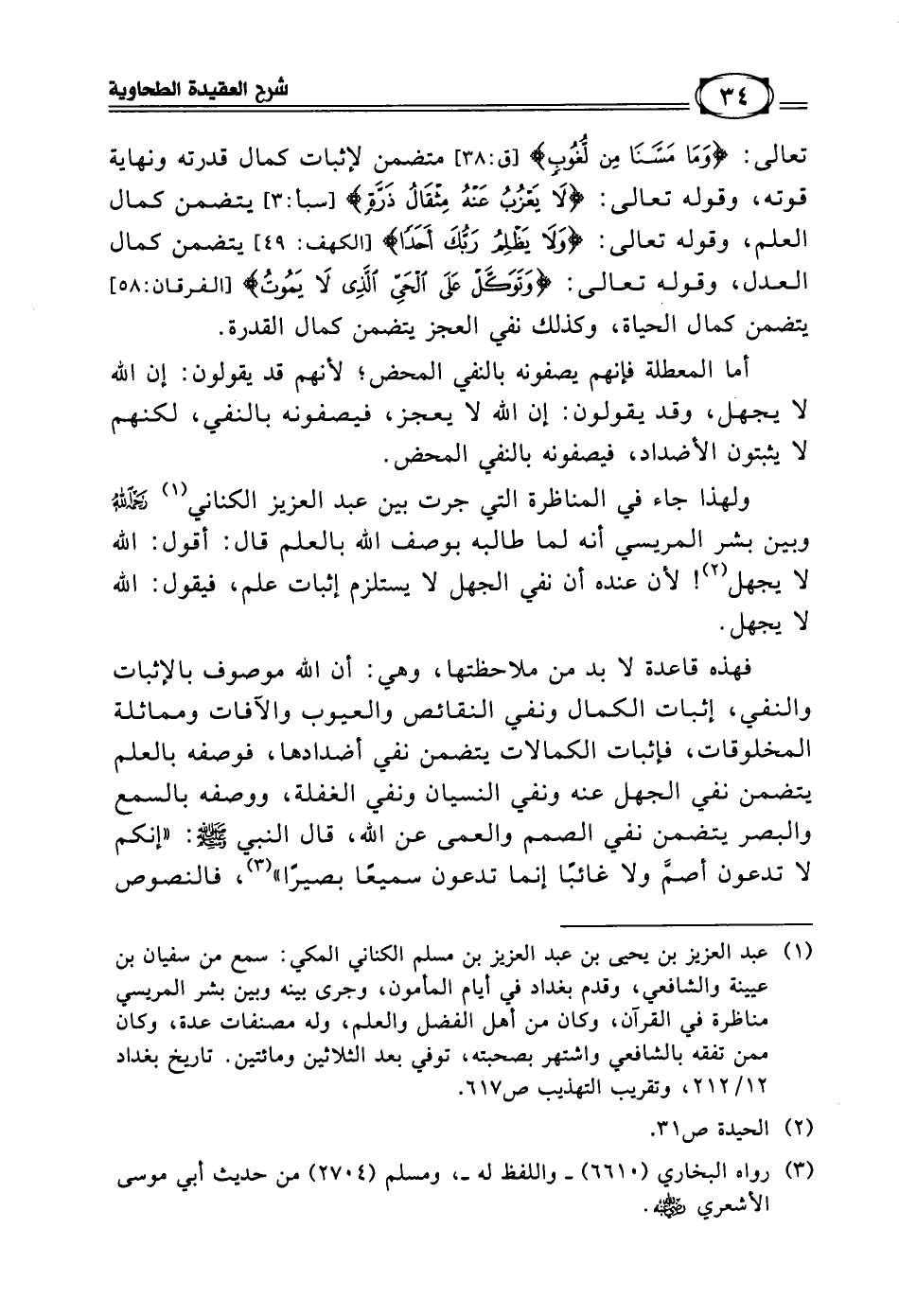 ولهذا جاء في المناظرة التي جرت بين عبد العزيز الكناني (¬1) ـ رحمه الله ـ وبين بشر المَرِيْسِي أنه لما طالبه بوصف الله بالعلم قال: أقول الله لا يجهل! (¬2) لأن عنده أن نفي الجهل لا يستلزم إثبات علم، فيقول: الله لا يجهل.
