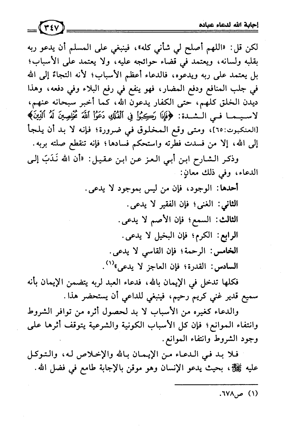 وذكر الشارح ابن أبي العز عن ابن عقيل: «أن الله نَدَبَ إلى الدعاء، وفي ذلك معانٍ: