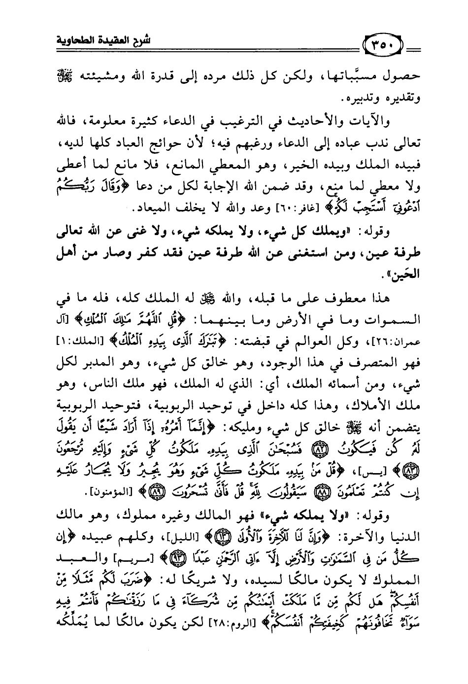 وقوله: (ولا يملكه شيء) فهو المالك وغيره مملوك، وهو مالك الدنيا والآخرة: ((وَإِنَّ لَنَا لَلآخِرَةَ وَالأُولَى)) [الليل: 13] وكلهم عبيده {إِن كُلُّ مَن فِي السَّمَاوَاتِ وَالْأَرْضِ إِلَّا آتِي الرَّحْمَنِ عَبْدًا} [مريم: 93] والعبد المملوك لا يكون مالكا لسيده، ولا شريكا له: ((ضَرَبَ لَكُمْ مَثَلًا مِنْ أَنْفُسِكُمْ هَلْ لَكُمْ مِنْ مَا مَلَكَتْ أَيْمَانُكُمْ مِنْ شُرَكَاءَ فِي مَا رَزَقْنَاكُمْ فَأَنْتُمْ فِيهِ سَوَاءٌ تَخَافُونَهُمْ كَخِيفَتِكُمْ أَنفُسَكُمْ)) [الروم: 28] لكن يكون مالكا لما يُمَلِّكُه