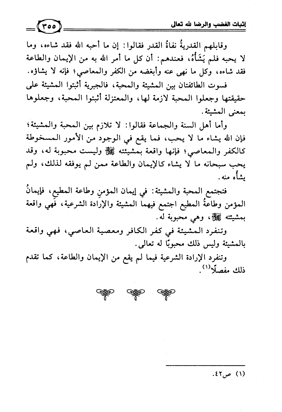فسوت الطائفتين بين المشيئة والمحبة، فالجبرية أثبتوا المشيئة على حقيقتها وجعلوا المحبة لازمة له، والمعتزلة أثبتوا المحبة، وجعلوها بمعنى المشيئة.