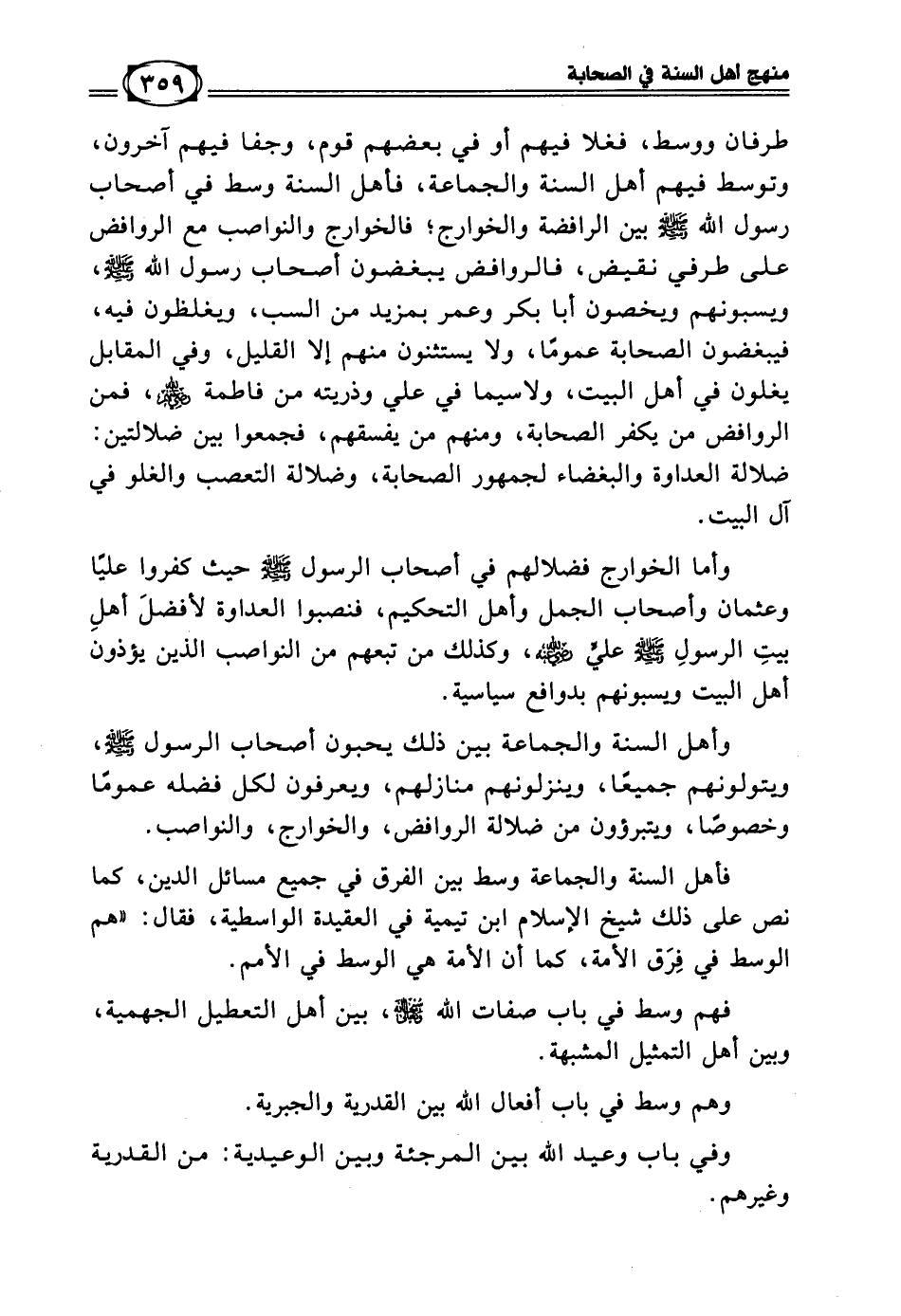 وأهل السنة والجماعة بين ذلك يحبون أصحاب الرسول - صلى الله عليه وسلم -، ويتولونهم جميعا، وينزلونهم منازلهم، ويعرفون لكل فضله عموما وخصوصا، ويتبرؤون من ضلالة الروافض، والخوارج، والنواصب.