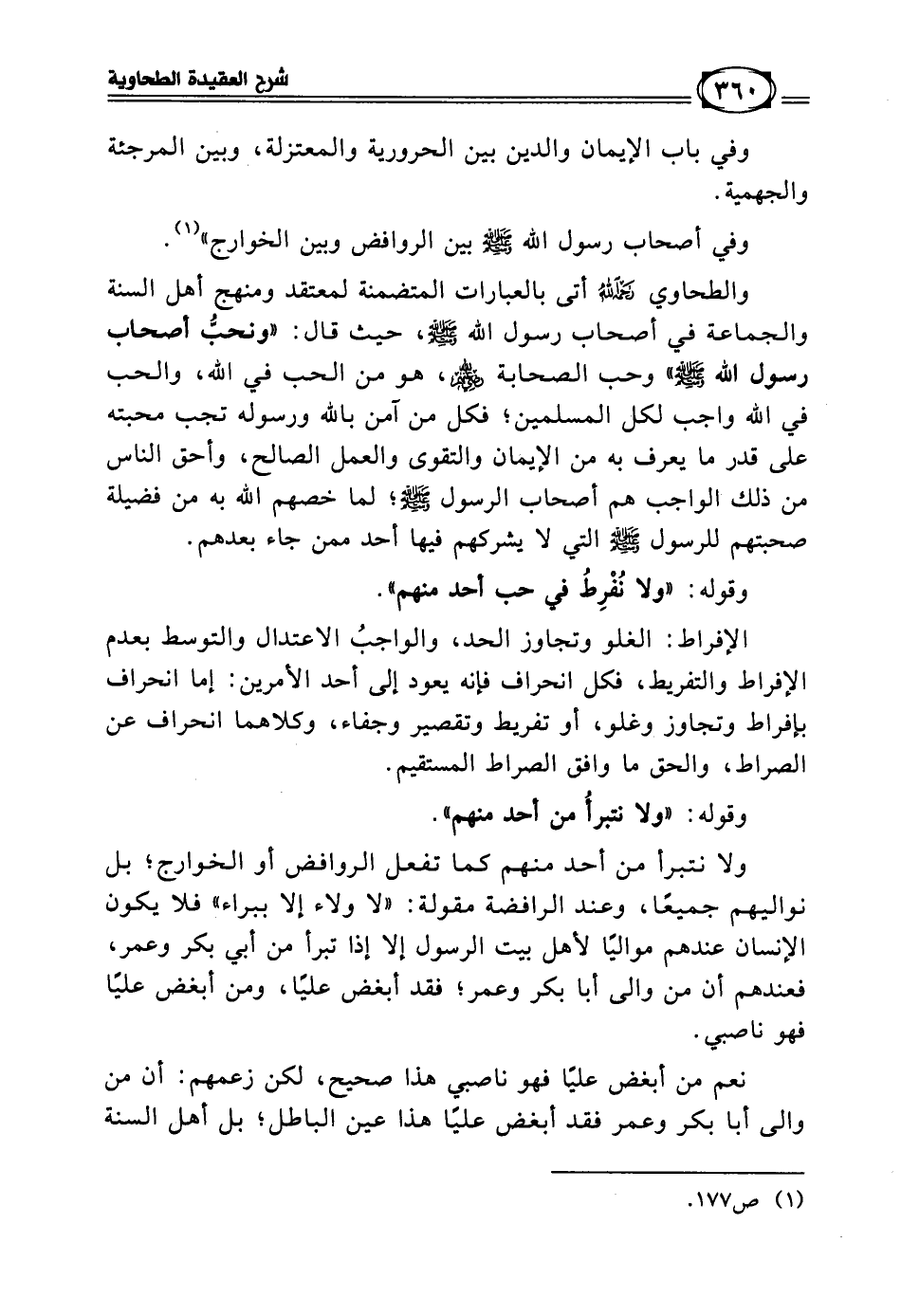 والطحاوي ـ رحمه الله ـ أتى بالعبارات المتضمنة لمعتقد ومنهج أهل السنة والجماعة في أصحاب رسول الله - صلى الله عليه وسلم -، حيث قال: (ونحبُ أصحاب رسول الله - صلى الله عليه وسلم -) وحب الصحابة رضي الله عنهم، هو من الحب في الله، والحب في الله واجب لكل المسلمين؛ فكل من آمن بالله ورسوله تجب محبته على قدر ما يعرف به من الإيمان والتقوى والعمل الصالح، وأحق الناس من ذلك الواجب هم أصحاب الرسول - صلى الله عليه وسلم -؛ لما خصهم الله به من فضيلة صحبتهم للرسول - صلى الله عليه وسلم - التي لا يشركهم فيها أحد ممن جاء بعدهم.