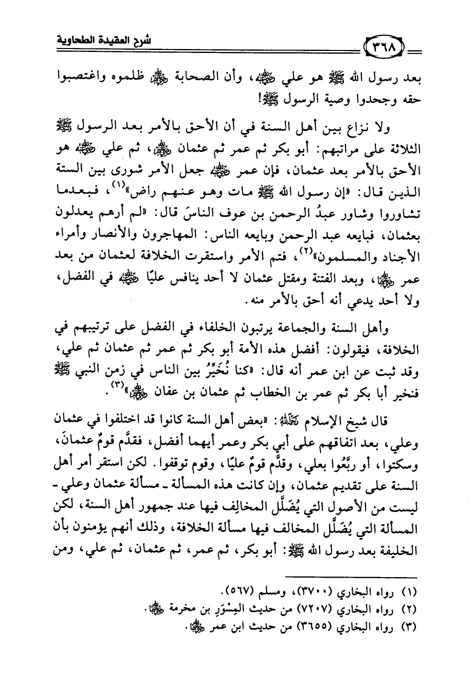 وأهل السنة والجماعة يرتبون الخلفاء في الفضل على ترتيبهم في الخلافة، فيقولون: أفضل هذه الأمة أبو بكر ثم عمر ثم عثمان ثم علي، وقد ثبت عن ابن عمر أنه قال: «كنا نُخَيِّرُ بين الناس في زمن النبي - صلى الله عليه وسلم - فنخير أبا بكر ثم عمر بن الخطاب ثم عثمان بن عفان رضي الله عنهم» (¬3).