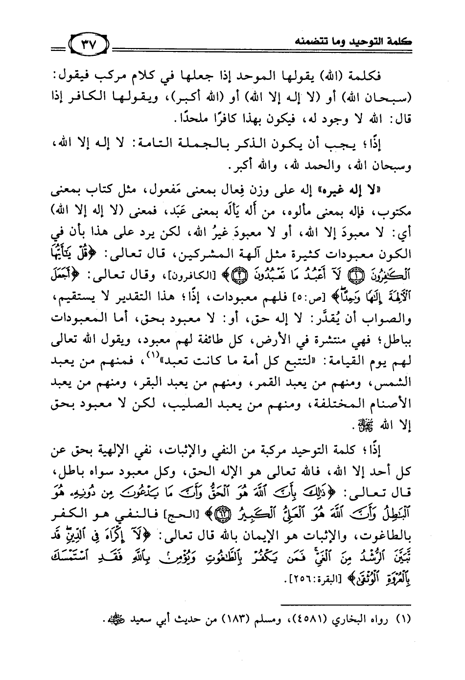 (لا إله غيره) إله على وزن فِعال بمعنى مَفعول، مثل كتاب بمعنى مكتوب، فإله بمعنى مألوه، من أَله يَأله بمعنى عَبَد، فمعنى (لا إله إلا الله) أي: لا معبودَ إلا الله، أو لا معبودَ غيرُ الله، لكن يرد على هذا بأن في الكون معبودات كثيرة مثل آلهة المشركين، قال تعالى: ((قُلْ يَا أَيُّهَا الْكَافِرُونَ * لا أَعْبُدُ مَا تَعْبُدُونَ)) [الكافرون: 1 - 2]، وقال تعالى: ((أَجَعَلَ الآلِهَةَ إِلَهًا وَاحِدًا)) [ص: 5] فلهم معبودات، إذًا؛ هذا التقدير لا يستقيم، والصواب أن يُقدَّر: لا إله حق، أو: لا معبود بحق، أما المعبودات بباطل؛ فهي منتشرة في الأرض، كل طائفة لهم معبود، ويقول الله تعالى لهم يوم القيامة: «لتتبع كل أمة ما كانت تعبد» (¬1).، فمنهم من يعبد الشمس، ومنهم من يعبد القمر، ومنهم من يعبد البقر، ومنهم من يعبد الأصنام المختلفة، ومنهم من يعبد الصليب، لكن لا معبود بحق إلا الله سبحانه وتعالى.
