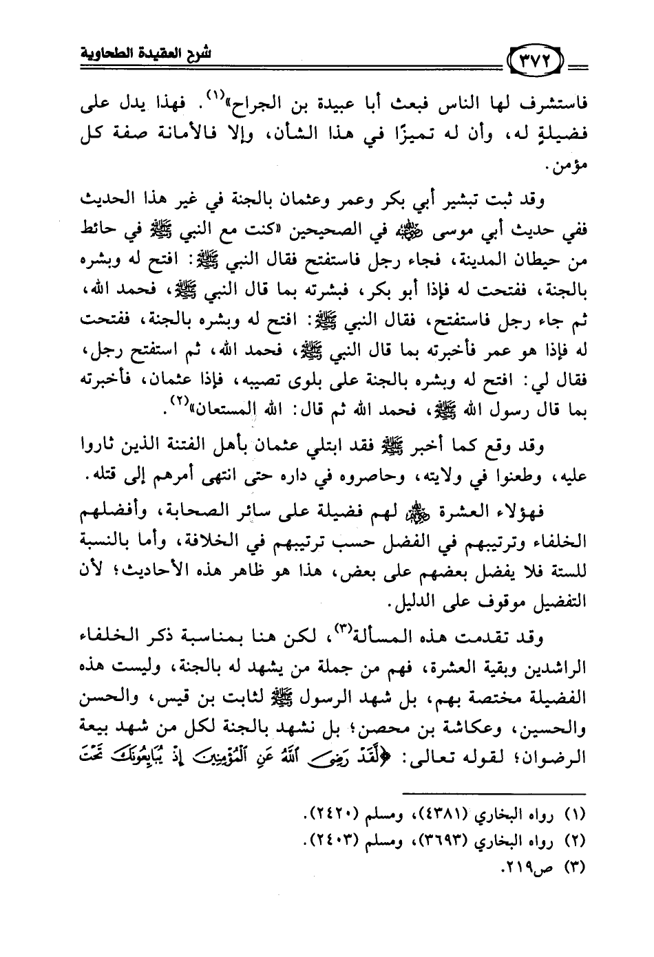 وقد تقدمت هذه المسألة (¬3)، لكن هنا بمناسبة ذكر الخلفاء الراشدين وبقية العشرة، فهم من جملة من يشهد له بالجنة، وليست هذه الفضيلة مختصة بهم، بل شهد الرسول - صلى الله عليه وسلم - لثابت بن قيس، والحسن والحسين، وعكاشة بن محصن؛ بل نشهد بالجنة لكل من شهد بيعة الرضوان؛ لقوله تعالى: ((لَقَدْ رَضِيَ اللَّهُ عَنِ الْمُؤْمِنِينَ إِذْ يُبَايِعُونَكَ تَحْتَ