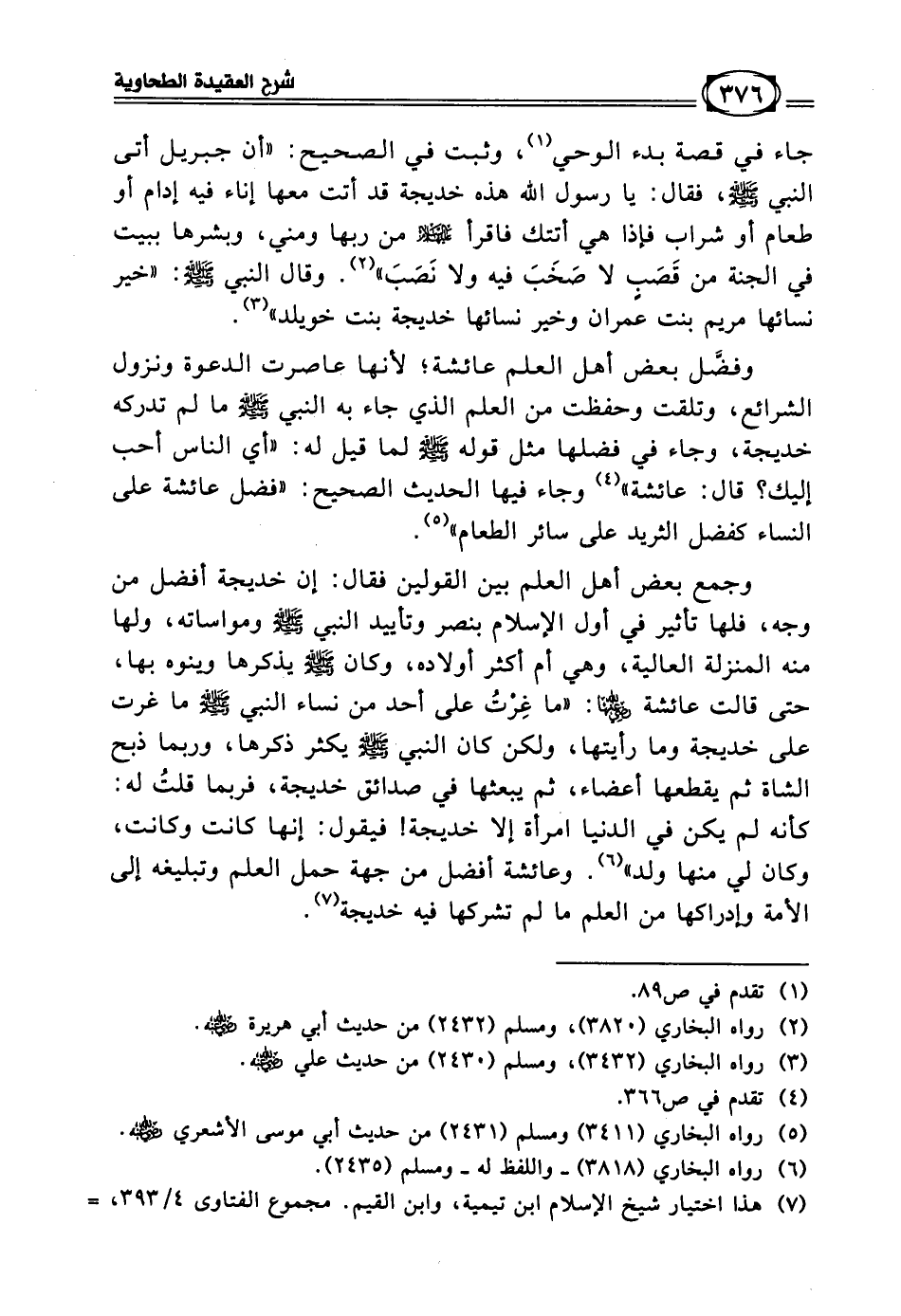 وفضَّل بعض أهل العلم عائشة؛ لأنها عاصرت الدعوة ونزول الشرائع، وتلقت وحفظت من العلم الذي جاء به النبي - صلى الله عليه وسلم - ما لم تدركه خديجة، وجاء في فضلها مثل قوله - صلى الله عليه وسلم - لما قيل له: (من أحب الناس إليك؟ قال: عائشة) (¬4) وجاء فيها الحديث الصحيح: (فضل عائشة على النساء كفضل الثريد على سائر الطعام) (¬5).