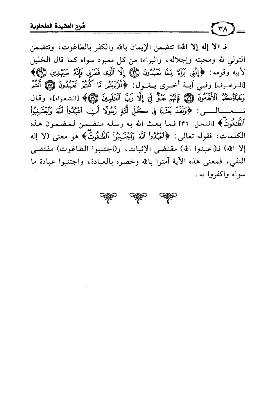 (لا إله إلا الله) بما تتضمنه من إيمان وكفر، تتضمن الإيمان بالله والكفر بالطاغوت، وتتضمن التولي لله ومحبته وإجلاله، والبراءة من كل معبود سواه كما قال الخليل لأبيه وقومه: ((إِنَّنِي بَرَاءٌ مِمَّا تَعْبُدُونَ * إِلَّا الَّذِي فَطَرَنِي فَإِنَّهُ سَيَهْدِينِ)) [الزخرف: 26 - 27] وفي آية أخرى يقول: ((أَفَرَأَيْتُمْ مَا كُنْتُمْ تَعْبُدُونَ * أَنْتُمْ وَآبَاؤُكُمُ الأَقْدَمُونَ * فَإِنَّهُمْ عَدُوٌّ لِي إِلَّا رَبَّ الْعَالَمِينَ)) [الشعراء: 75 - 77]، وقال تعالى: ((وَلَقَدْ بَعَثْنَا فِي كُلِّ أُمَّةٍ رَسُولًا أَنِ اُعْبُدُوا اللَّهَ وَاجْتَنِبُوا الطَّاغُوتَ)) [النحل: 36] فما بعث الله به رسله متضمن لمضمون هذه الكلمات، فقوله تعالى: ((اُعْبُدُوا اللَّهَ وَاجْتَنِبُوا الطَّاغُوتَ)) [النحل: 36] هو معنى (لا إله إلا الله) فـ (اعبدوا الله) مقتضى الإثبات، و (اجتنبوا الطاغوت) مقتضى النفي، فتضمنت هذه الآية (أَنِ اُعْبُدُوا اللَّهَ وَاجْتَنِبُوا الطَّاغُوتَ) آمنوا بالله وخصوه بالعبادة، واجتنبوا عبادة ما سواه واكفروا به.
