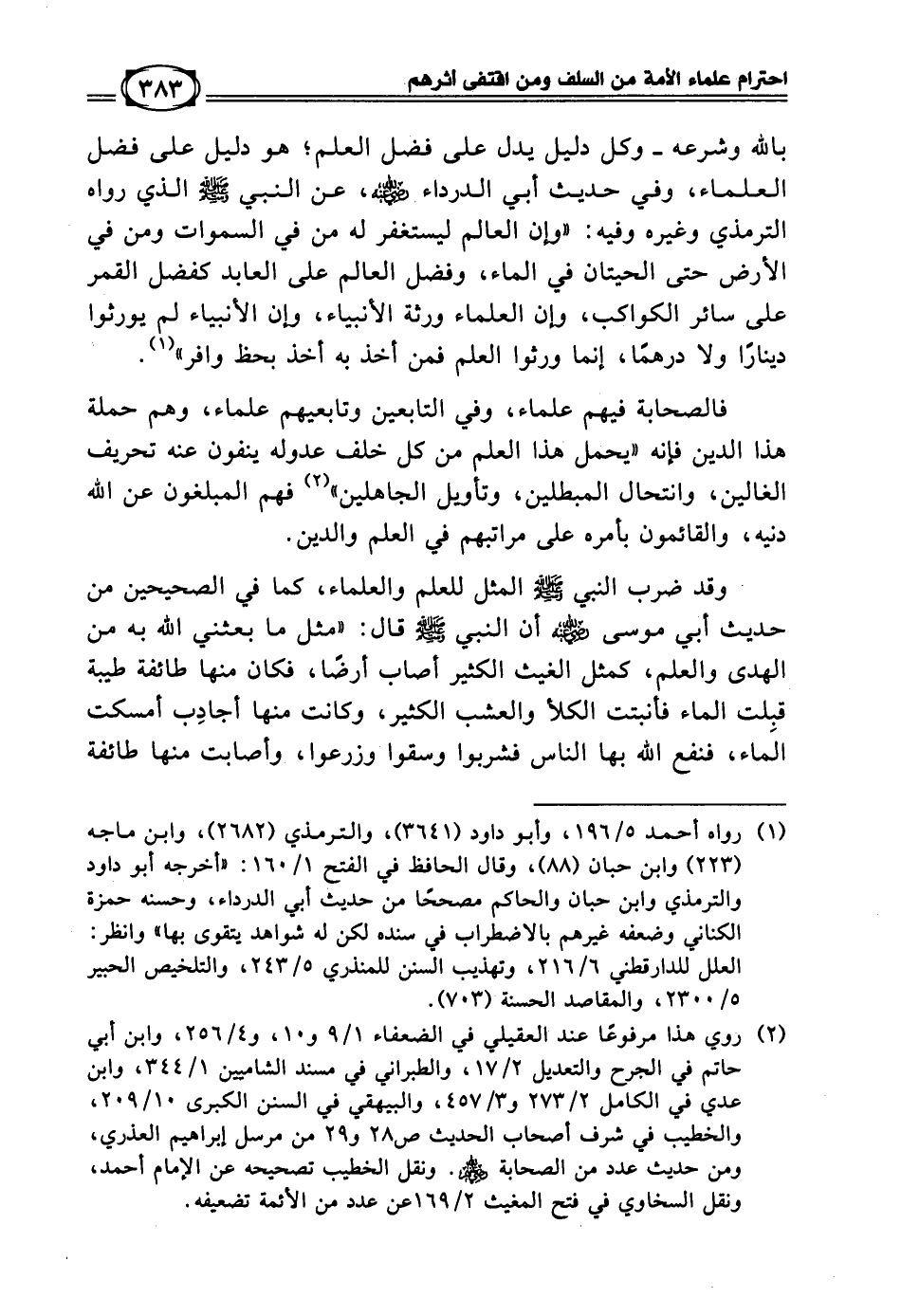 (¬1) رواه أحمد 5/ 196، وأبو داود (3641)، والترمذي (2682)، وابن ماجه (223) وابن حبان (88)، وقال الحافظ في الفتح 1/ 160: «أخرجه أبو داود والترمذي وابن حبان والحاكم مصححًا من حديث أبي الدرداء، وحسنه حمزة الكناني وضعفه غيرهم بالاضطراب في سنده لكن له شواهد يتقوى بها» وانظر: العلل للدارقطني 6/ 216، وتهذيب السنن للمنذري 5/ 243، والتلخيص الحبير 5/ 2300، والمقاصد الحسنة (703).