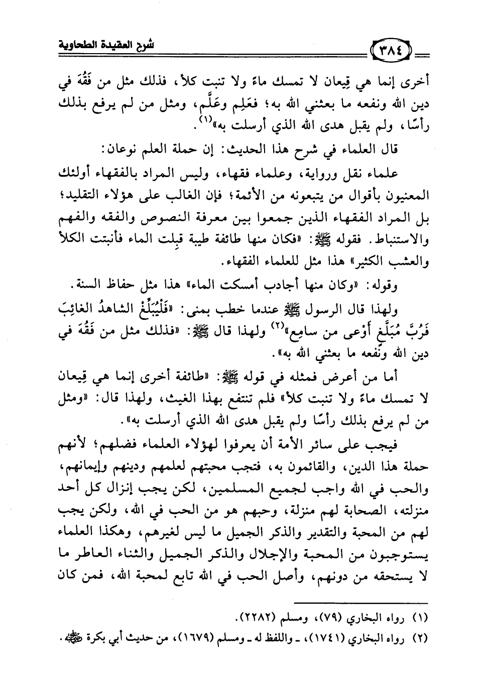 علماء نقل ورواية، وعلماء فقهاء، وليس المراد بالفقهاء أولئك المعنيون بأقوال من يتبعونه من الأئمة؛ فإن الغالب على هؤلاء التقليد؛ بل المراد الفقهاء الذين جمعوا بين معرفة النصوص والفقه والفهم والاستنباط. فقوله - صلى الله عليه وسلم -: (فكان منها طائفة طيبة قبِلت الماء فأنبتت الكلأ والعشب الكثير) هذا مثل للعلماء الفقهاء.