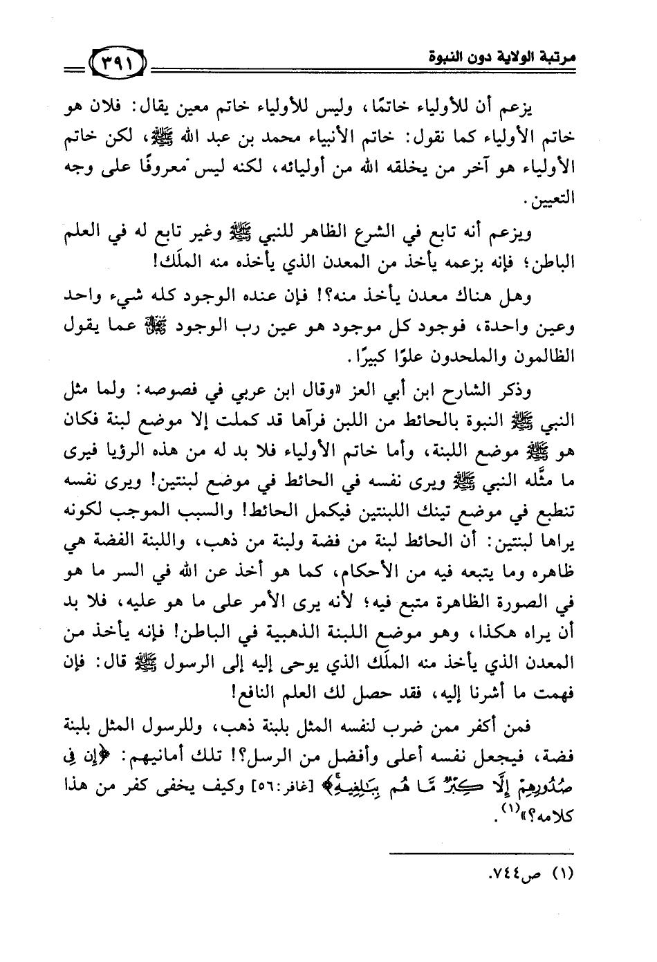 وذكر الشارح ابن أبي العز «وقال ابن عربي في فصوصه: ولما مثل النبي - صلى الله عليه وسلم - النبوة بالحائط من اللبن فرآها قد كملت إلا موضع لبنة فكان هو - صلى الله عليه وسلم - موضع اللبنة، وأما خاتم الأولياء فلا بد له من هذه الرؤية فيرى ما مثله النبي - صلى الله عليه وسلم - ويرى نفسه في الحائط في موضع لبنتين! ويرى نفسه تنطبع في موضع تينك اللبنتين فيكمل الحائط! والسبب الموجب لكونه يراها لبنتين: أن الحائط لبنة من فضة ولبنة من ذهب، واللبنة الفضة هي ظاهره وما يتبعه فيه من الأحكام، كما هو أخذ عن الله في السر ما هو في الصورة الظاهرة متبع فيه؛ لأنه يرى الأمر على ما هو عليه، فلا بد أن يراه هكذا، وهو موضع اللبنة الذهبية في الباطن! فإنه يأخذ من المعدن الذي يأخذ منه الملَك الذي يوحى إليه إلى الرسول - صلى الله عليه وسلم - قال: فإن فهمت ما أشرنا إليه، فقد حصل لك العلم النافع!