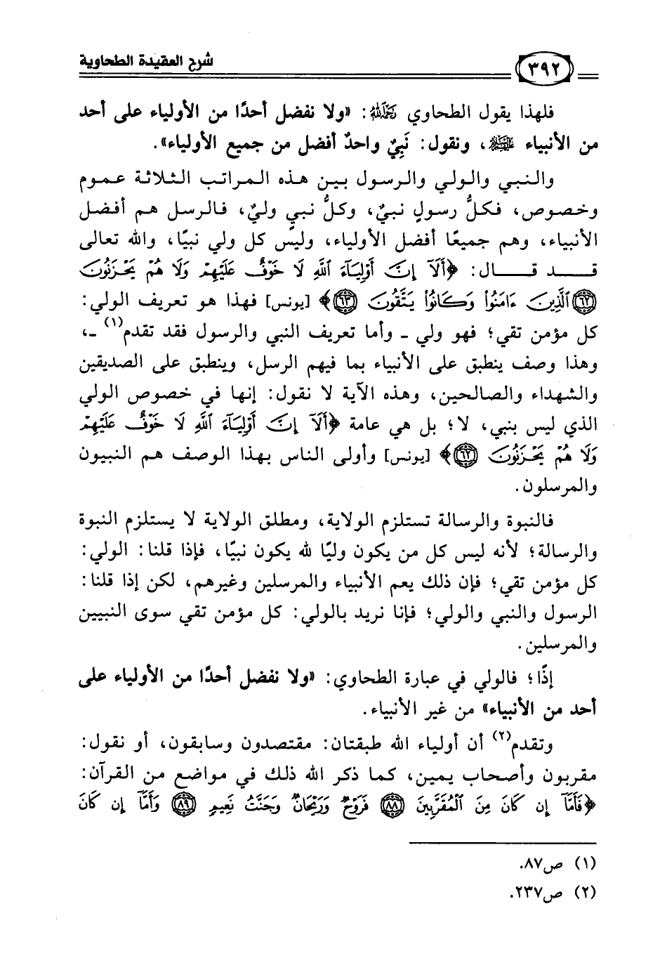فلهذا يقول الطحاوي ـ رحمه الله ـ: (ولا نفضل أحدا من الأولياء على أحد من الأنبياء عليهم السلام، ونقول: نَبِيٌ واحدٌ أفضل من جميع الأولياء).