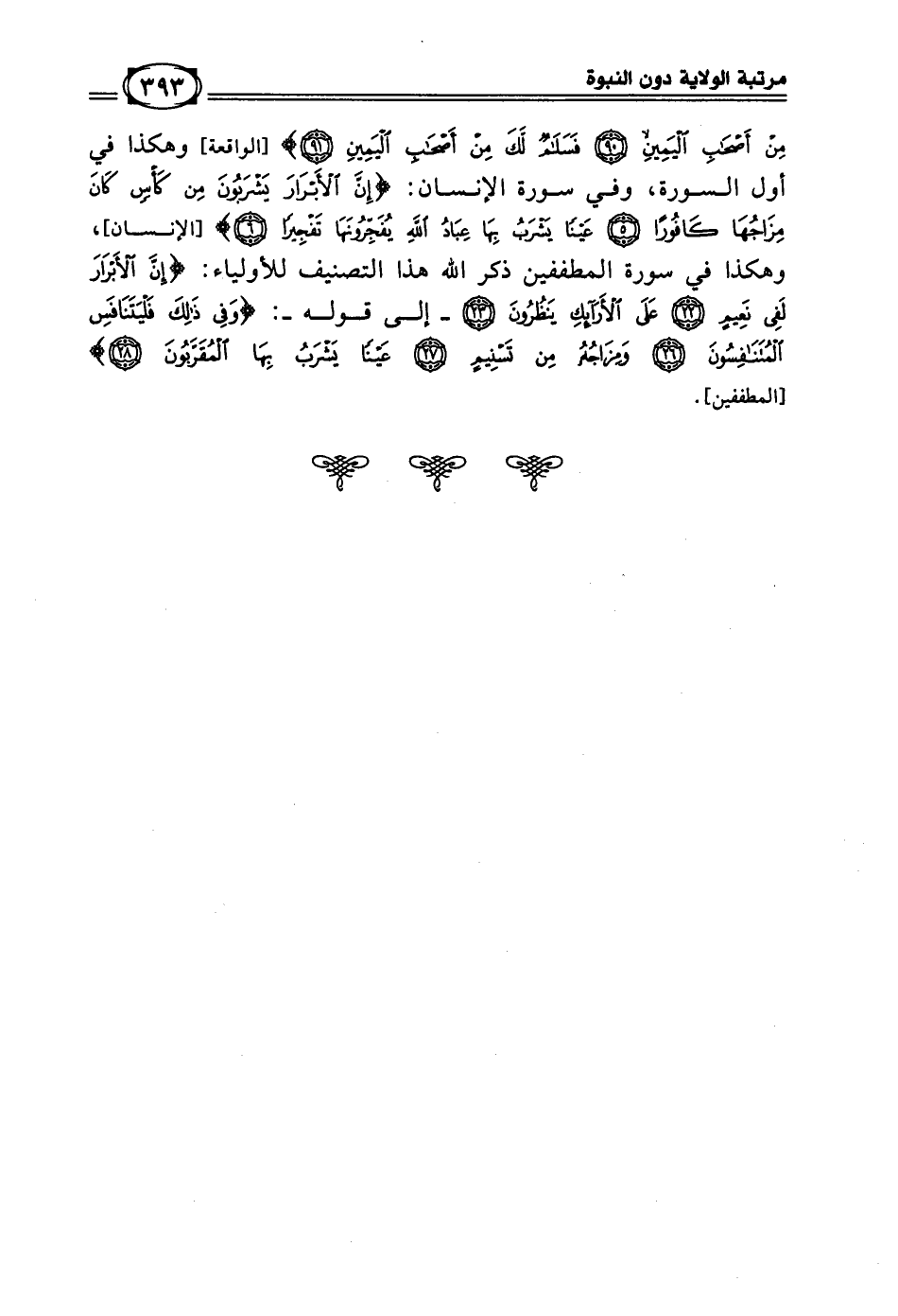مِنْ أَصْحَابِ الْيَمِينِ * فَسَلامٌ لَكَ مِنْ أَصْحَابِ الْيَمِينِ)) [الواقعة: 88 - 91] وهكذا في أول السورة، وفي سورة الإنسان: ((إِنَّ الأَبْرَارَ يَشْرَبُونَ مِنْ كَأْسٍ كَانَ مِزَاجُهَا كَافُورًا * عَيْنًا يَشْرَبُ بِهَا عِبَادُ اللَّهِ يُفَجِّرُونَهَا تَفْجِيرًا)) [الإنسان: 5 - 6]، وهكذا في سورة المطففين ذكر الله هذا التصنيف للأولياء: ((إِنَّ الأَبْرَارَ لَفِي نَعِيمٍ * عَلَى الأَرَائِكِ يَنظُرُونَ ـ إلى قوله ـ: وَفِي ذَلِكَ فَلْيَتَنَافَسِ الْمُتَنَافِسُونَ * وَمِزَاجُهُ مِنْ تَسْنِيمٍ * عَيْنًا يَشْرَبُ بِهَا الْمُقَرَّبُونَ)) [المطففين: 22 - 28] (¬1).