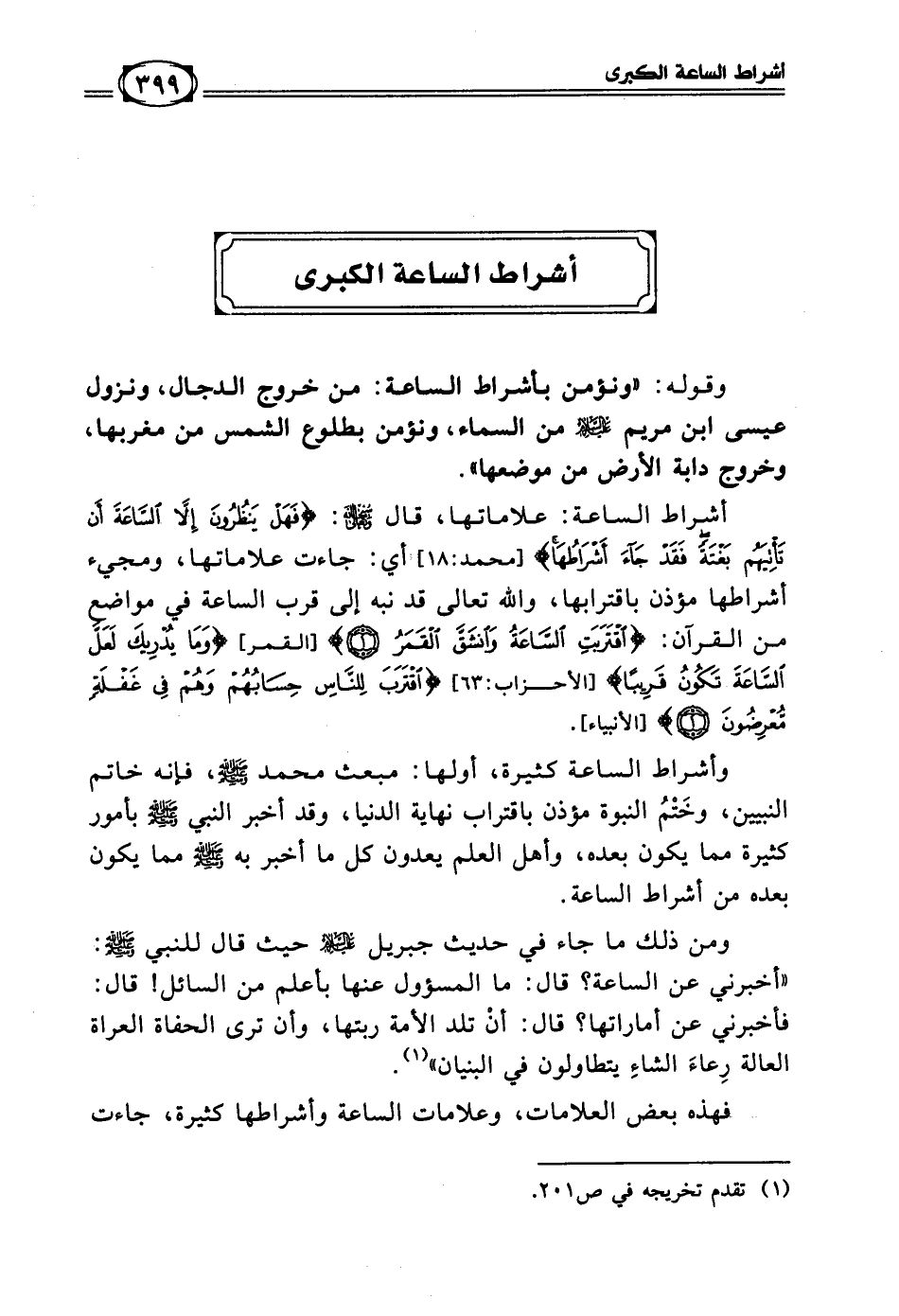 وقوله: (ونؤمن بأشراط الساعة: من خروج الدجال، ونزول عيسى بن مريم عليه السلام من السماء، ونؤمن بطلوع الشمس من مغربها، وخروج دابة الأرض من موضعها).