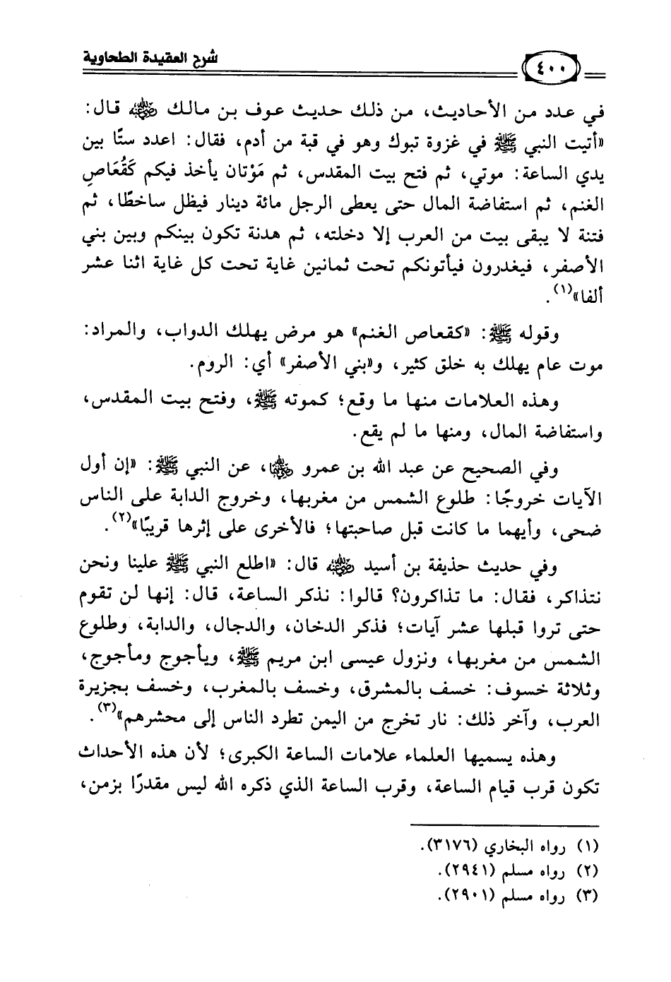 وفي الصحيح عن عبد الله بن عمرو رضي الله عنهما عن النبي - صلى الله عليه وسلم -: «إن أول الآيات خروجا طلوع الشمس من مغربها، وخروج الدابة على الناس ضحى، وأيهما ما كانت قبل صاحبتها؛ فالأخرى على إثرها قريبا» (¬2).