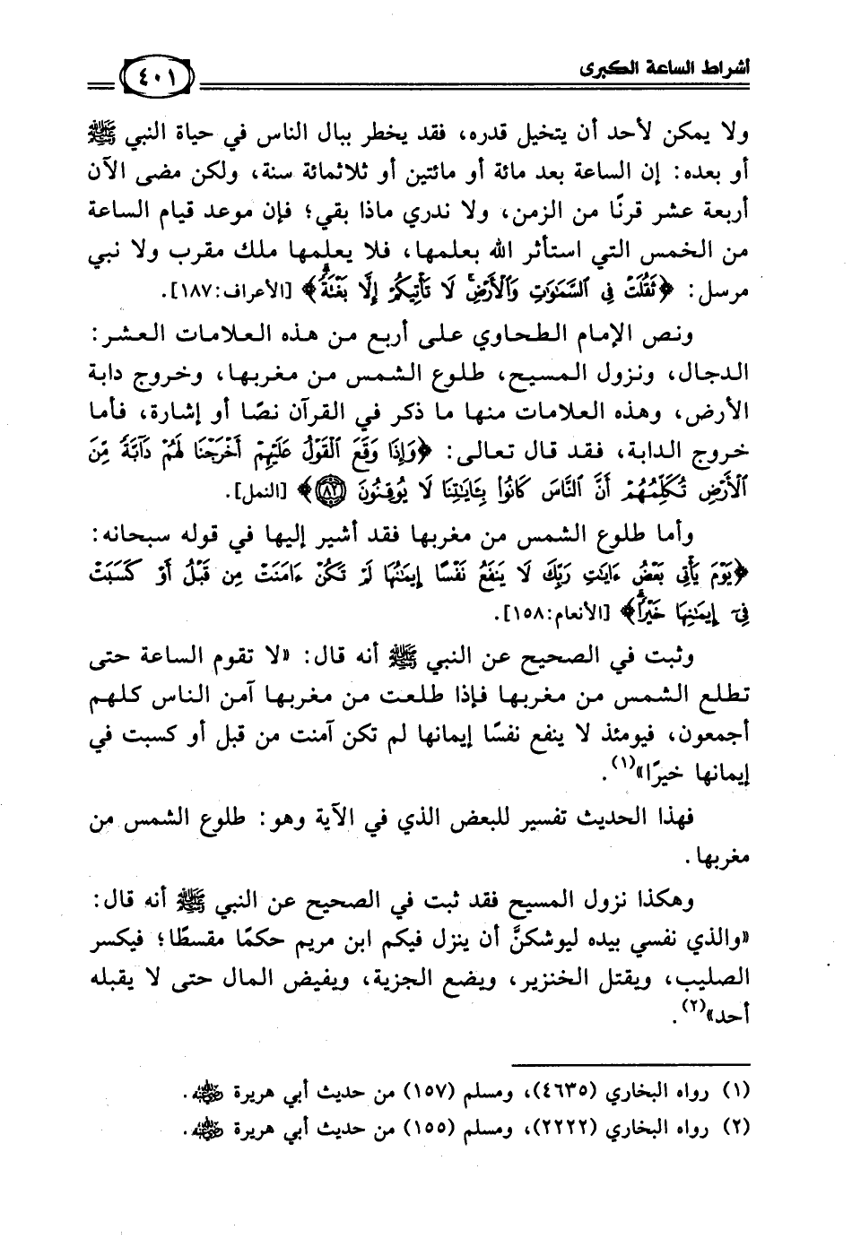 ونص الإمام الطحاوي على أربع من هذه العلامات العشر: الدجال، ونزول المسيح، طلوع الشمس من مغربها، وخروج دابة الأرض، وهذه العلامات منها ما ذكر في القرآن نصا أو إشارة، فأما خروج الدابة، فقد قال تعالى: ((وَإِذَا وَقَعَ الْقَوْلُ عَلَيْهِمْ أَخْرَجْنَا لَهُمْ دَابَّةً مِنَ الأَرْضِ تُكَلِّمُهُمْ أَنَّ النَّاسَ كَانُوا بِآيَاتِنَا لا يُوقِنُونَ)) [النمل: 82].