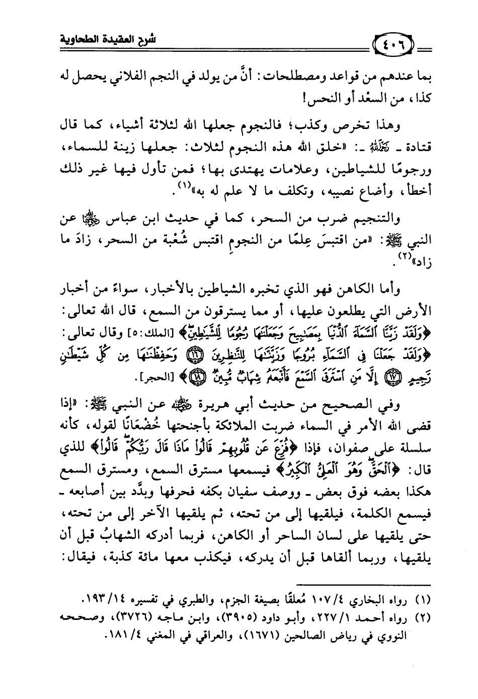 والتنجيم ضرب من السحر، كما في حديث ابن عباس عن النبي - صلى الله عليه وسلم -: «من اقتبسَ عِلمًا من النجومِ اقتبس شُعْبة من السحر زادَ ما زاد» (¬2).