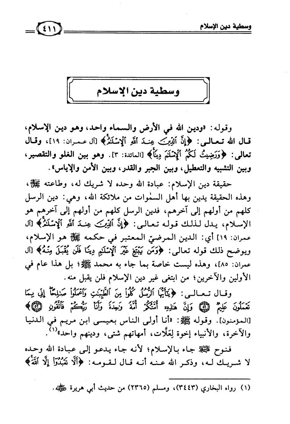 وقوله: (ودين الله في الأرض والسماء واحد، وهو دين الإسلام، قال الله تعالى: {إن الدين عند الله الإسلام}، وقال تعالى: {ورضيت لكم الإسلام دينا}. وهو بين الغلو والتقصير، وبين التشبيه والتعطيل، وبين الجبر والقدر، وبين الأمن والإياس).