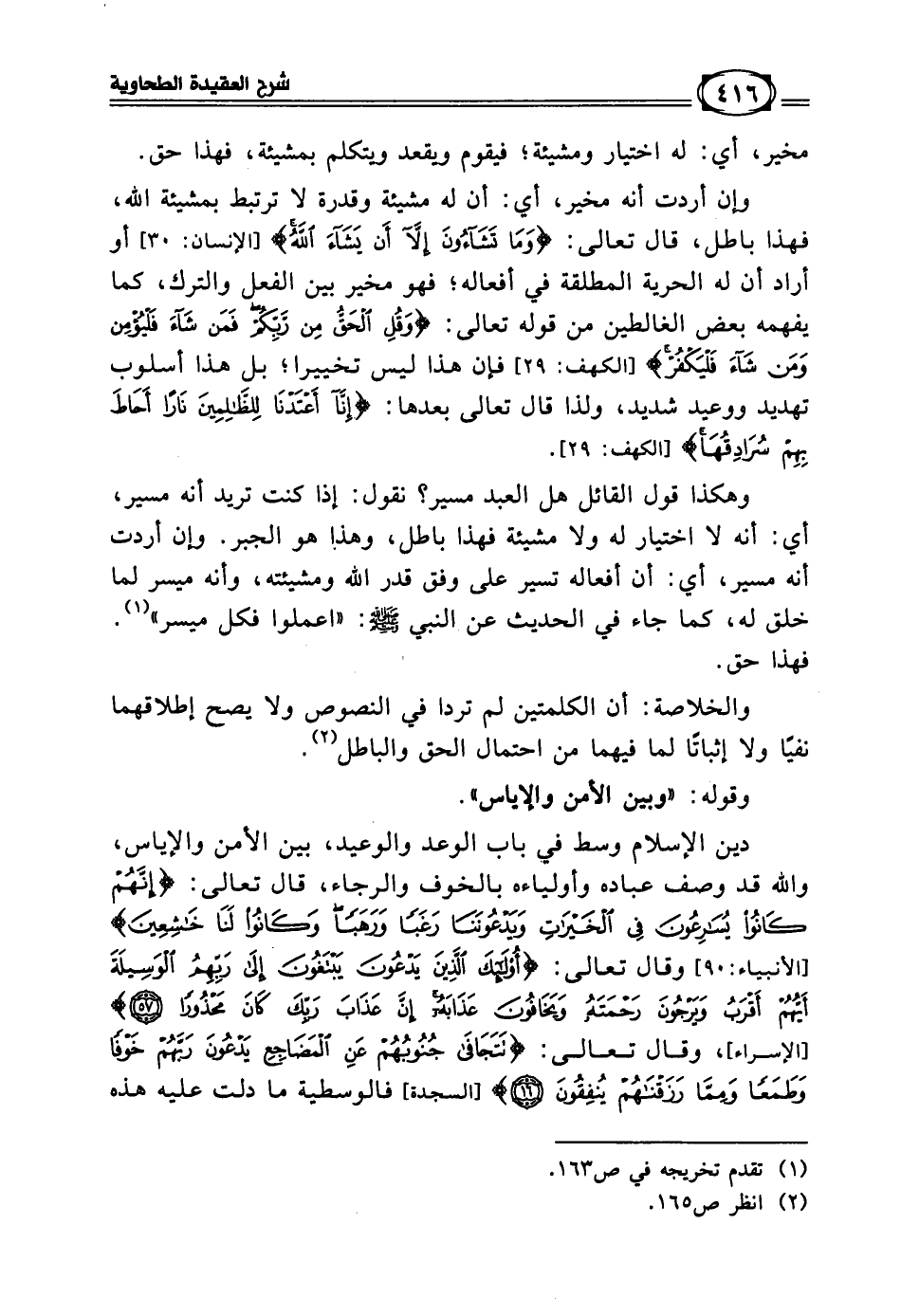 وإن أردت أنه مخير، أي: أن له مشيئة وقدرة لا ترتبط بمشيئة الله، فهذا باطل، قال تعالى: (وما تشاءون إلا أن يشاء الله) أو أراد أن له الحرية المطلقة في أفعاله؛ فهو مخير بين الفعل والترك، كما يفهمه بعض الغالطين من قوله تعالى: (وقل الحق من ربكم فمن شاء فليؤمن ومن شاء فليكفر) فإن هذا ليس تخييرا؛ بل هذا أسلوب تهديد ووعيد شديد، ولذا قال تعالى بعدها: (إنا أعتدنا للظالمين نارا أحاط بهم سرادقها).