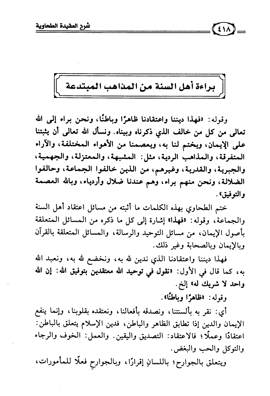 وقوله: (فهذا ديننا واعتقادنا ظاهرا وباطنا، ونحن براء إلى الله تعالى من كل من خالف الذي ذكرناه وبيناه. ونسأل الله تعالى أن يثبتنا على الإيمان، ويختم لنا به، ويعصمنا من الأهواء المختلفة، والآراء المتفرقة، والمذاهب الردية، مثل: المشبهة، والمعتزلة، والجهمية، والجبرية، والقدرية، وغيرهم، من الذين خالفوا الجماعة، وحالفوا الضلالة، ونحن منهم براء، وهم عندنا ضلال وأردياء، وبالله العصمة والتوفيق).