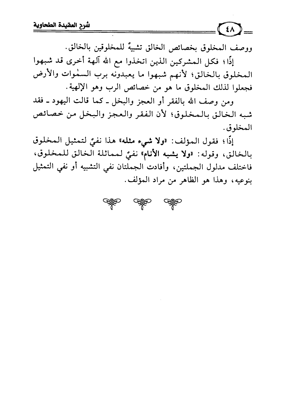 إذاً؛ فقول المؤلف (ولا شيء مثله) هذا نفيٌ لتمثيل المخلوق بالخالق، وقوله (ولا يشبه الأنام) نفيٌ لمماثلة الخالق للمخلوق، فاختلف مدلول الجملتين، وأفادت الجملتان نفي التشبيه أو نفي التمثيل بنوعيه، وهذا هو المطلوب.