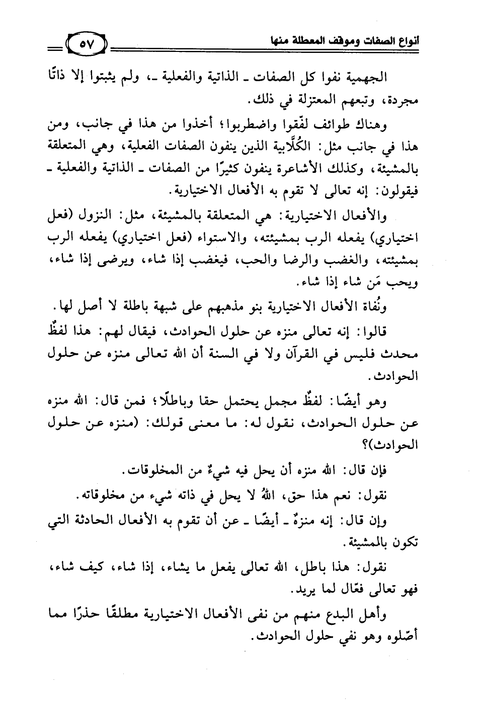 وأهل البدع منهم من نفى الأفعال الاختيارية مطلقا حذرا مما أصّلوه وهو نفي حلول الحوادث.