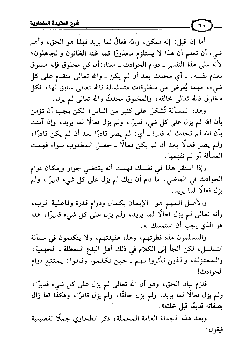 فلزم بيان الحق، وهو أن الله تعالى لم يزل على كل شيء قدير، ولم يزل فعالا لما يريد، ولم يزل خالقا، ولم يزل قادرا، وهكذا (مازال بصفاته قديما قبل خلقه)
