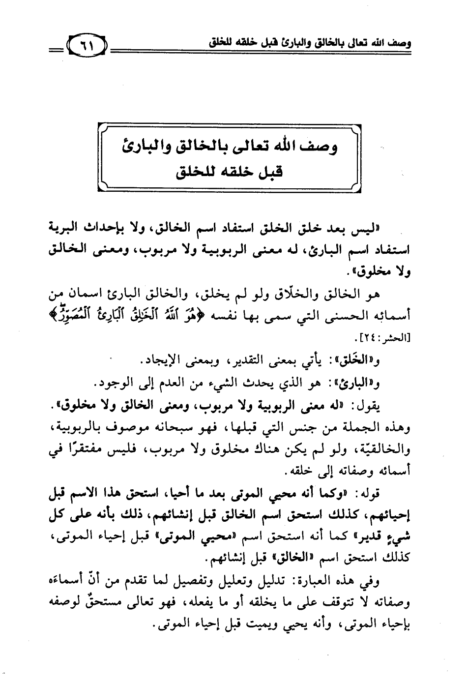 (ليس بعد خلق الخلق استفاد اسم «الخالق»، ولا بإحداث البرية استفاد اسم «البارئ» له معنى الربوبية ولا مربوب، ومعنى الخالق ولا مخلوق).