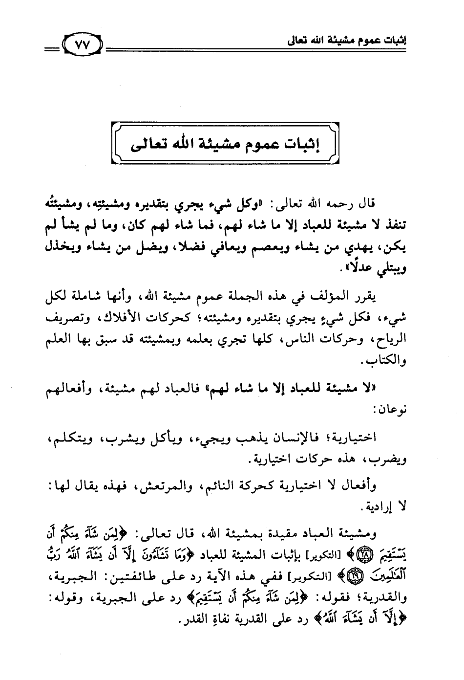 ومشيئة العباد مقيدة بمشيئة الله، قال تعالى: ((لِمَنْ شَاءَ مِنْكُمْ أَنْ يَسْتَقِيمَ)) بإثبات المشيئة للعباد ((وَمَا تَشَاءُونَ إِلَّا أَنْ يَشَاءَ اللَّهُ رَبُّ الْعَالَمِينَ)) [التكوير: 29] ففي هذه الآية رد على طائفتين: الجبرية، والقدرية؛ فقوله: ((لِمَنْ شَاءَ مِنْكُمْ أَنْ يَسْتَقِيمَ)) رد على الجبرية، وقوله: ((إِلَّا أَنْ يَشَاءَ اللَّهُ)) رد على القدرية نفاةِ القدر.