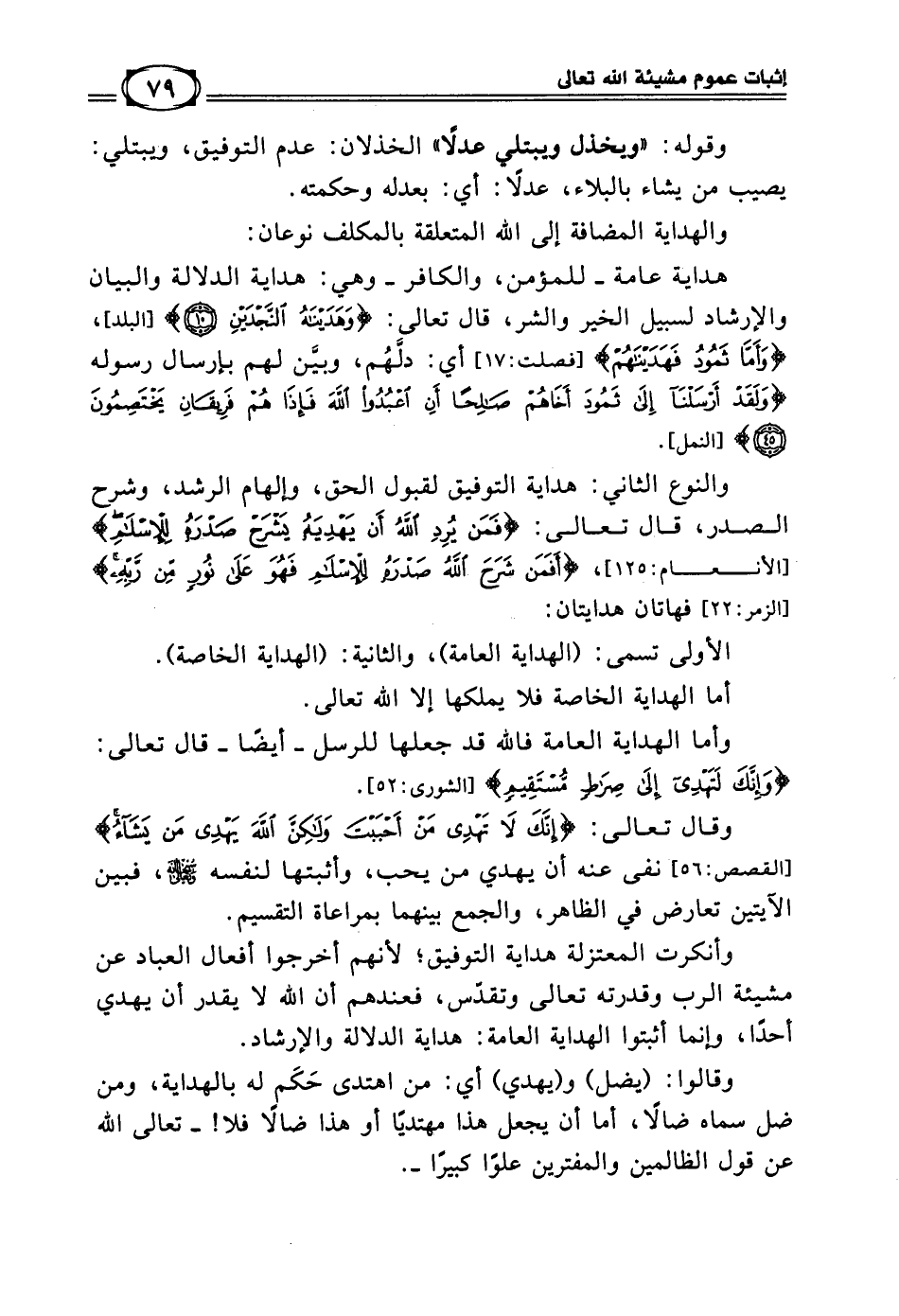 هداية عامة ـ للمؤمن، والكافر ـ وهي: هداية الدلالة، والبيان، والإرشاد لسبيل الخير والشر، قال تعالى: ((وَهَدَيْنَاهُ النَّجْدَيْنِ)) [البلد: 10]، ((وَأَمَّا ثَمُودُ فَهَدَيْنَاهُمْ)) [فصلت: 17] أي: دلَّهُم، وبيَّن لهم بإرسال رسوله ((وَلَقَدْ أَرْسَلْنَا إِلَى ثَمُودَ أَخَاهُمْ صَالِحًا أَنِ اعْبُدُوا اللَّهَ فَإِذَا هُمْ فَرِيقَانِ يَخْتَصِمُونَ)) [النمل: 45].
