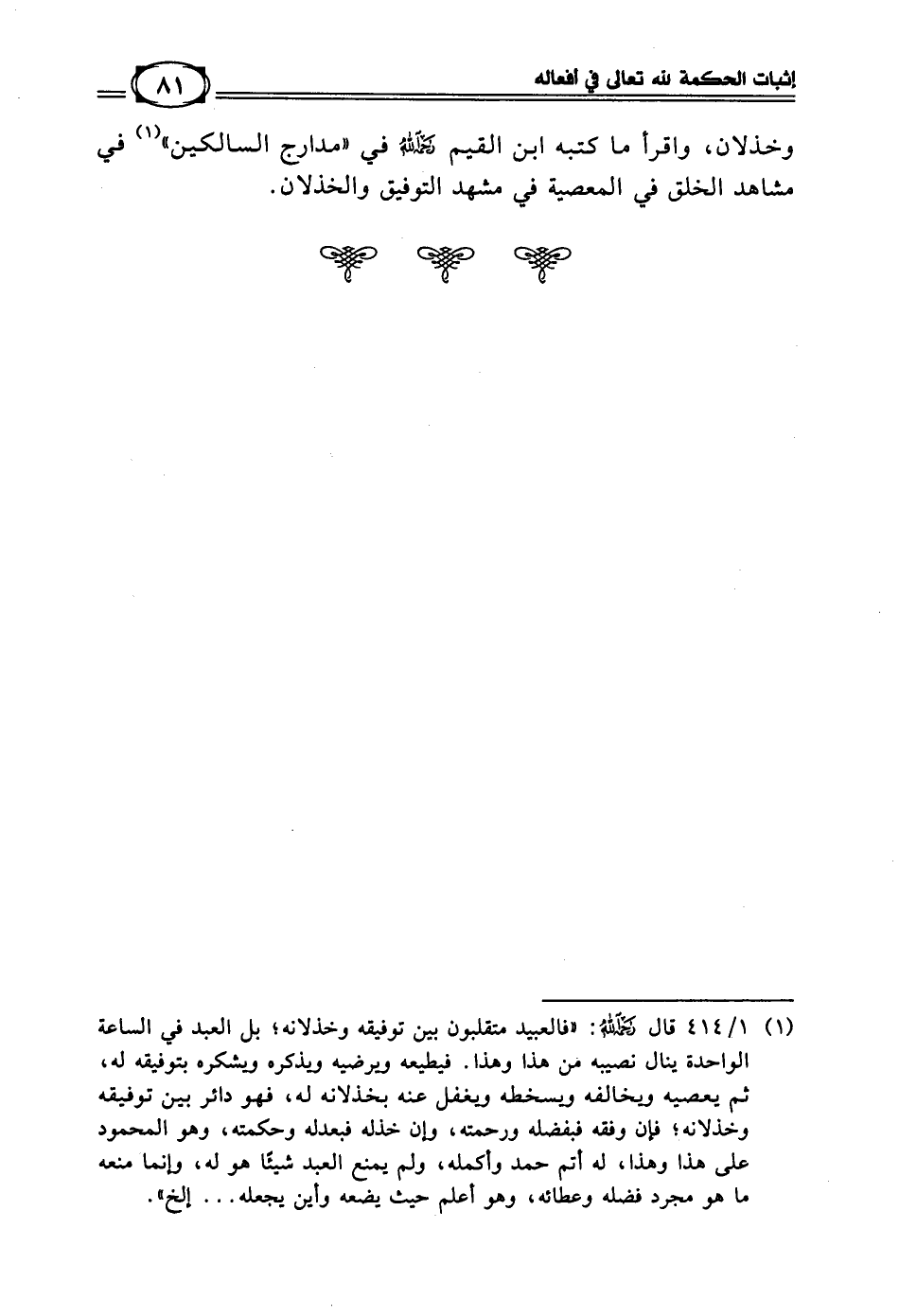 (¬1) 1/ 414 «فالعبيد متقلبون بين توفيقه وخذلانه؛ بل العبد في الساعة الواحدة ينال نصيبه من هذا وهذا. فيطيعه ويرضيه ويذكره ويشكره بتوفيقه له، ثم يعصيه ويخالفه ويسخطه ويغفل عنه بخذلانه له، فهو دائر بين توفيقه وخذلانه؛ فإن وفقه فبفضله ورحمته، وإن خذله فبعدله وحكمته، وهو المحمود على هذا وهذا له أتم حمد وأكمله، ولم يمنع العبد شيئا هو له، وإنما منعه ما هو مجرد فضله وعطائه وهو أعلم حيث يضعه وأين يجعله».