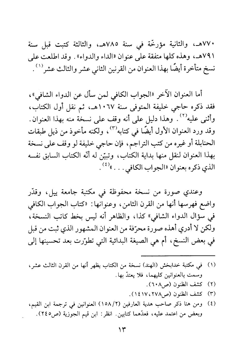 أما العنوان الآخر "الجواب الكافي لمن سأل عن الدواء الشافي"، فقد ذكره حاجي خليفة المتوفى سنة 1067 هـ، ثم نقل أول الكتاب، وأثنى عليه (¬2). وهذا دليل على أنه وقف على نسخة منه بهذا العنوان.