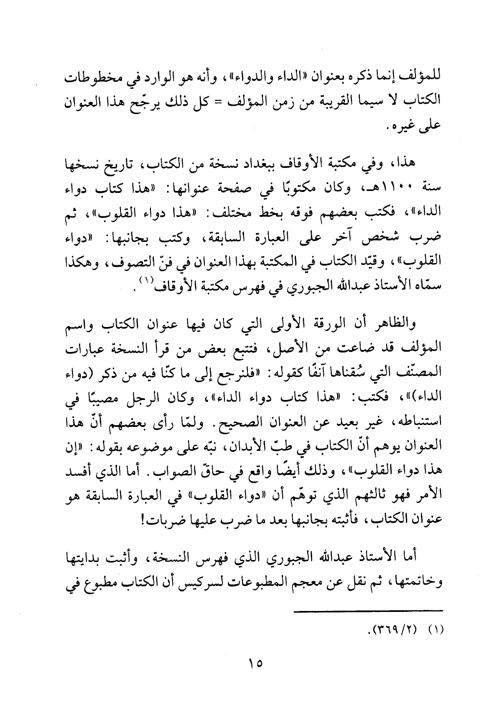 الداء) "، فكتب: "هذا كتاب دواء الداء"، وكان الرجل مصيبَا في استنباطه، غير بعيد عن العنوان الصحيح. ولمّا رأى بعضهم أنّ هذا العنوان يوهم أنّ الكتاب في طبّ الأبدان، نبّه على موضوعه بقوله: "إن هذا دواء القلوب"، وذلك أيضًا واقع في حاقّ الصواب. أما الذي أفسد الأمر فهو ثالثهم الذي توهّم أن "دواء القلوب" في العبارة السابقة هو عنوان الكتاب، فأثبته بجانبها بعد ما ضرب عليها ضربات! أما الأستاذ عبد الله الجبوري الذي فهرس النسخة، وأثبت بدايتها وخاتمتها، ثم نقل عن معجم المطبوعات لسركيس أن الكتاب مطبوع في