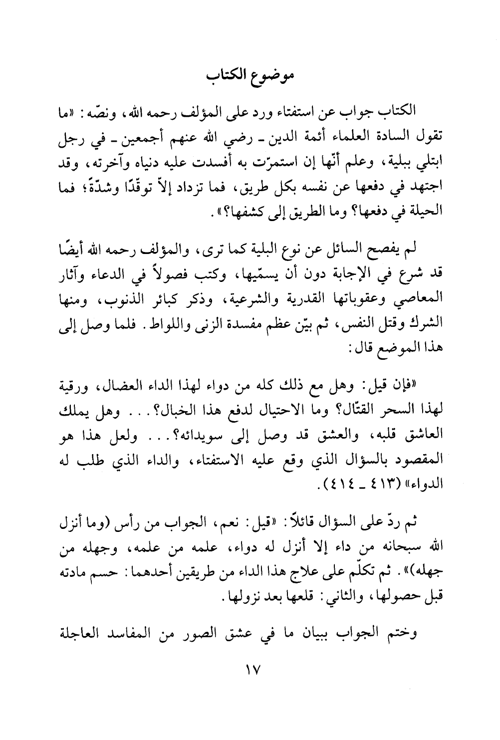 الكتاب جواب عن استفتاء ورد على المؤلف رحمه الله، ونصّه: "ما تقول السادة العلماء أئمة الدين -رضي الله عنهم أجمعين- في رجل ابتلي ببلية، وعلم أنّها إن استمرّت به أفسدت عليه دنياه وآخرته، وقد اجتهد في دفعها عن نفسه بكل طريق، فما تزداد إلاّ توقّدًا وشدّةً؛ فما الحيلة في دفعها؟ وما الطريق إلى كشفها؟ ".
