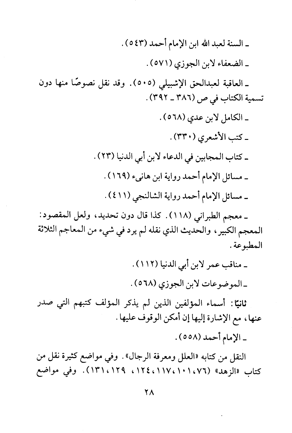النقل من كتابه "العلل ومعرفة الرجال". وفي مواضع كثيرة نقل من كتاب "الزهد" (76، 101، 171، 124، 129، 131). وفي مواضع