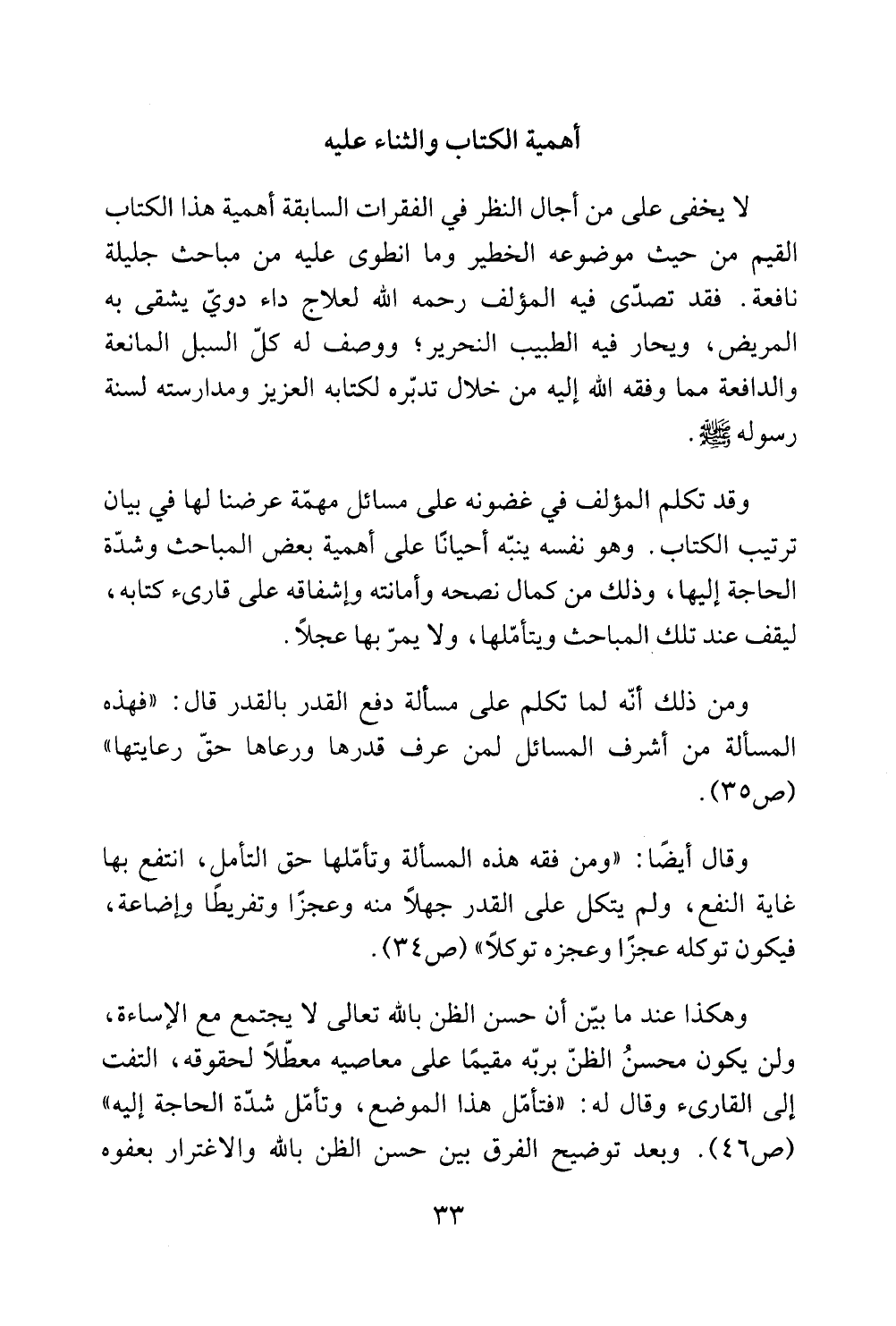 ومن ذلك أنّه لما تكلم على مسألة دفع القدر بالقدر قال: "فهذه المسألة من أشرف المسائل لمن عرف قدرها ورعاها حقّ رعايتها" (ص 35).