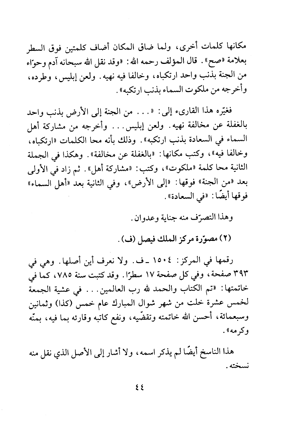مكانها كلمات أخرى، ولما ضاق المكان أضاف كلمتين فوق السطر بعلامة "صح". قال المؤلف رحمه الله: "وقد نقل الله سبحانه آدم وحوّاء من الجنة بذنب واحد ارتكباه، وخالفا فيه نهيه. ولعن إبليس، وطرده، وأخرجه من ملكوت السماء بذنب ارتكبه".