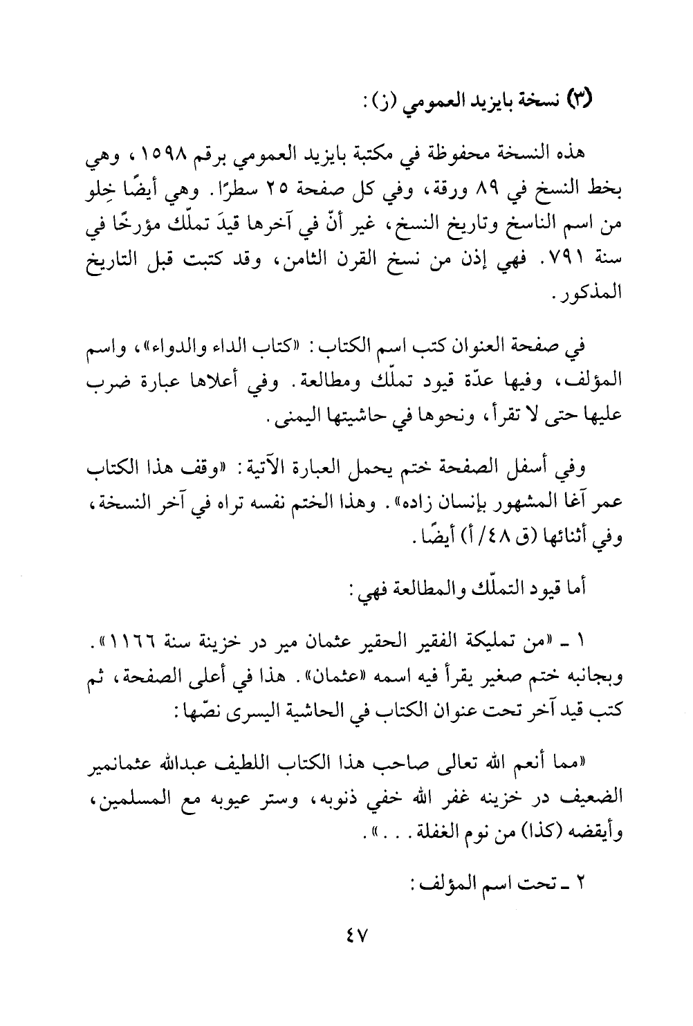 هذه النسخة محفوظة في مكتبة بايزيد العمومي برقم 1598، وهي بخط النسخ في 89 ورقة، وفي كل صفحة 25 سطرًا. وهي أيضًا خِلو من اسم الناسخ وتاريخ النسخ، غير أنّ في آخرها قيدَ تملّك مؤرخًا في سنة 791. فهي إذن من نسخ القرن الثامن، وقد كتبت قبل التاريخ المذكور.