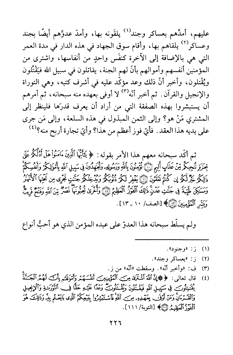 (¬4) قال تعالى: {إِنَّ اللَّهَ اشْتَرَى مِنَ الْمُؤْمِنِينَ أَنْفُسَهُمْ وَأَمْوَالَهُمْ بِأَنَّ لَهُمُ الْجَنَّةَ يُقَاتِلُونَ فِي سَبِيلِ اللَّهِ فَيَقْتُلُونَ وَيُقْتَلُونَ وَعْدًا عَلَيْهِ حَقًّا فِي التَّوْرَاةِ وَالْإِنْجِيلِ وَالْقُرْآنِ وَمَنْ أَوْفَى بِعَهْدِهِ مِنَ اللَّهِ فَاسْتَبْشِرُوا بِبَيْعِكُمُ الَّذِي بَايَعْتُمْ بِهِ وَذَلِكَ هُوَ الْفَوْزُ الْعَظِيمُ (111)} [التوبة: 111].